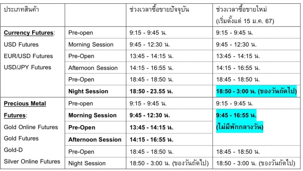กรุงเทพฯ 12 ม.ค.- ตลาดสัญญาซื้อขายล่วงหน้าขยายเวลาซื้อขายสินค้ากลุ่ม Currency Futures ในช่วงกลางคืนจนถึงตี 3 ของวันถัดไป และขยายเวลาซื้อขายสินค้ากลุ่ม Precious Metal Futures ในช่วงกลางวัน ให้เทรดได้ต่อเนื่องไม่มีหยุดพัก เพื่อให้สอดคล้องกับเวลาการซื้อขายของตลาดโลกมากขึ้น เริ่ม 15 ม.ค. 2567
