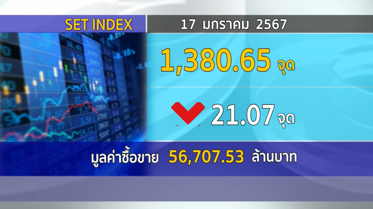 กทม. 17 ม.ค.-SET ปิดวันนี้ที่ 1,380.65 จุด ลดลง 21.07 จุด (-1.50%) มูลค่าการซื้อขาย 56,707.53 ล้านบาท