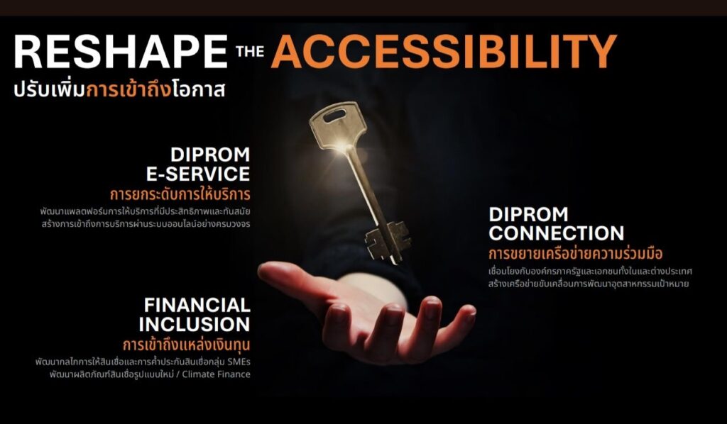 และหัตถกรรมไทย ผ่านการพัฒนาผลิตภัณฑ์สินเชื่อรูปแบบใหม่ที่สอดรับกับความต้องการของแต่ละกลุ่มและการเงินเพื่อการเปลี่ยนแปลงสภาพภูมิอากาศ (Climate Finance) ควบคู่ไปกับการเสริมสร้างองค์ความรู้ด้านการเงินเบื้องต้น (Financial Literacy) การยกระดับการให้บริการ (DIPROM E-SERVICE) โดยเร่งการปฏิรูประบบการให้บริการของภาครัฐให้ก้าวทันการเปลี่ยนแปลงอย่างฉับพลันด้วยเทคโนโลยีดิจิทัล (Digital Disruption)