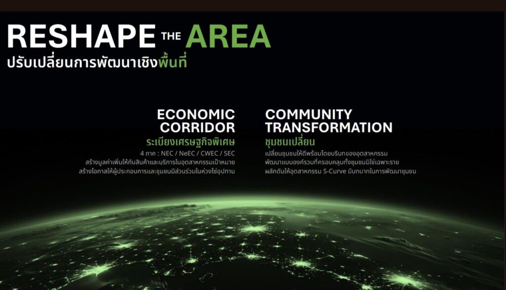 2. ปรับเปลี่ยนการพัฒนาเชิงพื้นที่ (RESHAPE THE AREA) ผ่านการพัฒนาระเบียงเศรษฐกิจพิเศษ 4 ภาค (ECONOMIC CORRIDOR) ได้แก่ ระเบียงเศรษฐกิจพิเศษภาคเหนือ (NEC) ระเบียงเศรษฐกิจพิเศษภาคตะวันออกเฉียงเหนือ (NeEC) ระเบียงเศรษฐกิจพิเศษภาคกลาง-ตะวันตก (CWEC) และระเบียงเศรษฐกิจพิเศษภาคใต้ (SEC) โดยการสร้างมูลค่าเพิ่มตลอดห่วงโซ่อุปทานให้กับสินค้าและบริการที่มีศักยภาพในอุตสาหกรรมเป้าหมายของแต่ละพื้นที่ รวมถึงการสร้างโอกาสให้ผู้ประกอบการและชุมชนมีส่วนร่วมในห่วงโซ่อุปทานเพื่อให้ได้รับประโยชน์จากการพัฒนาอย่างทั่วถึง และการพัฒนาชุมชนตามแนวคิด “ชุมชนเปลี่ยน” (COMMUNITY TRANSFORMATION) ด้วยการเปลี่ยนชุมชนให้ดีพร้อมโดยบริบทของอุตสาหกรรม มุ่งเน้น การพัฒนาที่ขับเคลื่อนจากชุมชน (Community-led Development) และการพัฒนาแบบองค์รวมที่ครอบคลุม ทั้งชุมชนมิใช่เพียงเฉพาะราย ตลอดจนเชื่อมโยงและเปิดโอกาสให้ผู้ประกอบการในอุตสาหกรรมแห่งอนาคต (S-Curve) เข้ามามีส่วนร่วมและบทบาทในการเปลี่ยนชุมชนด้วยเครื่องมือ กระบวนการ หรือเทคโนโลยีที่สอดคล้องกับระดับศักยภาพของชุมชนในแต่ละพื้นที่
