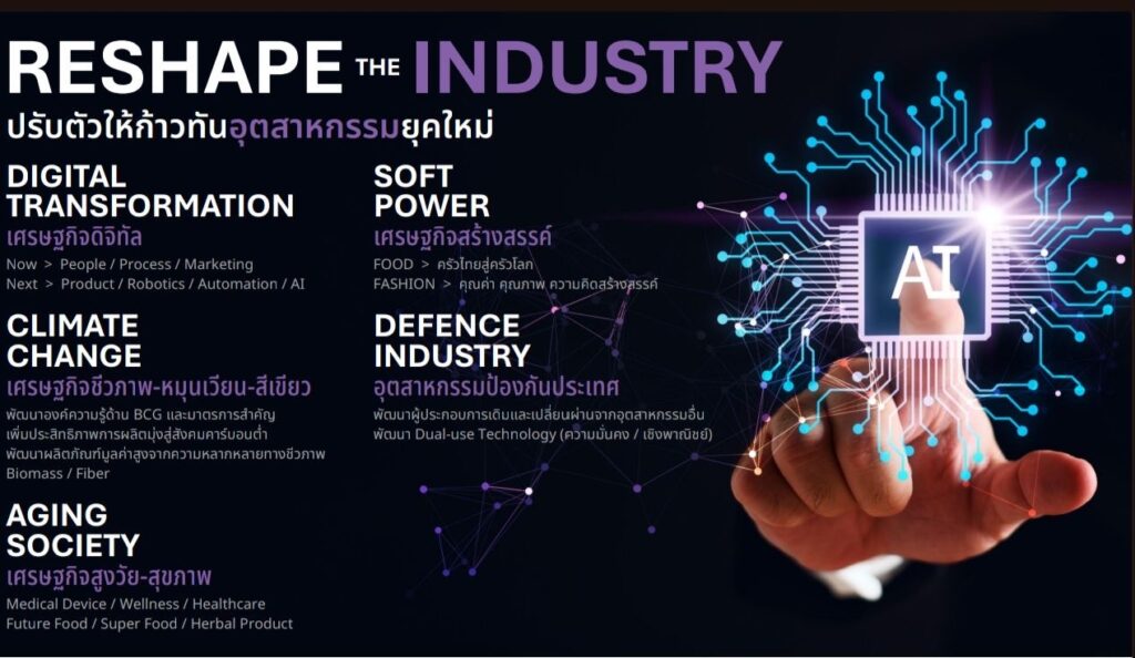 1. ปรับตัวให้ก้าวทันเศรษฐกิจยุคใหม่ (RESHAPE THE ECONOMY) ผ่านการส่งเสริมเศรษฐกิจดิจิทัล (DIGITAL TRANSFORMATION) ด้วยการประยุกต์ใช้เทคโนโลยีดิจิทัลในภาคอุตสาหกรรมทั้งในด้านการพัฒนาบุคลากร (People) กระบวนการผลิต (Process) การตลาด (Marketing) และผลิตภัณฑ์ (Product) รวมถึงเทคโนโลยีหุ่นยนต์ (Robotics) ระบบอัตโนมัติ (Automation) และปัญญาประดิษฐ์ (AI) เพื่อให้ผู้ประกอบการสามารถเปลี่ยนผ่านสู่ยุคเศรษฐกิจดิจิทัลได้อย่างไร้รอยต่อ การส่งเสริมเศรษฐกิจสูงวัย เศรษฐกิจสุขภาพ (AGING SOCIETY) ด้วยการพัฒนาสินค้าและบริการด้าน Wellness & Healthcare ให้สอดคล้องกับผู้บริโภคในกลุ่มผู้สูงอายุและผู้บริโภคที่ให้ความสำคัญกับการดูแลสุขภาพเชิงป้องกัน