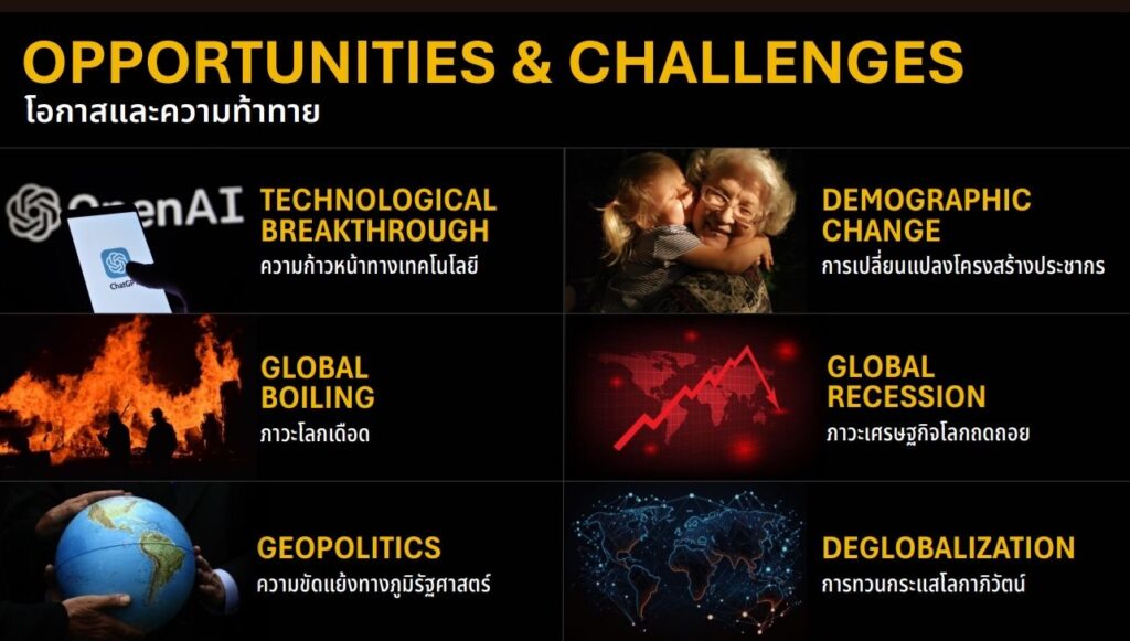 ให้กับผู้ประกอบการ ไม่ว่าจะเป็นความก้าวหน้าทางเทคโนโลยี การเปลี่ยนแปลงโครงสร้างประชากร ภาวะโลกเดือด ภาวะเศรษฐกิจโลก ความขัดแย้งทางภูมิรัฐศาสตร์ การทวนกระแสโลกาภิวัตน์ และเมื่อโลกเปลี่ยนอุตสาหกรรมและผู้ประกอบการก็ต้องมีการปรับเพื่อให้พร้อมรับกับอนาคต