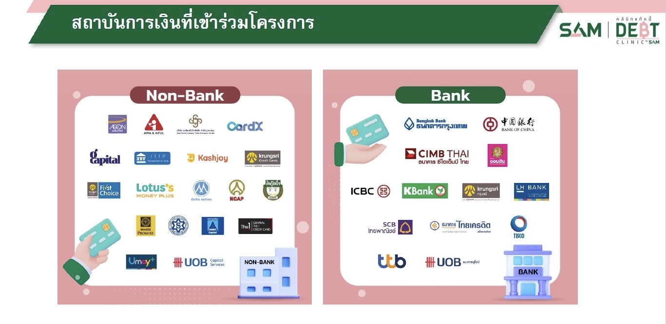 ทั้งนี้ โครงการคลินิกแก้หนี้ by SAM” ให้ความช่วยเหลือลูกหนี้ที่เป็นหนี้เสียประเภทบัตรเครดิต บัตรกดเงินสดและสินเชื่อส่วนบุคคลที่ไม่มีหลักประกัน มียอดค้างชำระมากกว่า 120 วัน ด้วยอัตราดอกเบี้ยพิเศษเพียง 3-5% ต่อปี และระยะเวลาผ่อนนานสูงสุด ถึง 10 ปี โดยมีทางเลือกการปรับโครงสร้างหนี้ เป็น 3 ทางเลือก คือ 1. ผ่อนชำระไม่เกิน 4 ปี อัตราดอกเบี้ยร้อยละ 3 ต่อปี 2. ผ่อนชำระนานกว่า 4 ปี ไม่เกิน 7 ปี อัตราดอกเบี้ยร้อยละ 4 ต่อปี 3. ผ่อนชำระนานกว่า 7 ปี ไม่เกิน 10 ปี อัตราดอกเบี้ยร้อยละ 5 ต่อปี โดยมีคุณสมบัติของผู้สมัครคือเป็นบุคคลธรรมดาที่มีรายได้ มีอายุไม่เกิน 70 ปี มียอดหนี้รวมกันไม่เกิน 2 ล้านบาท