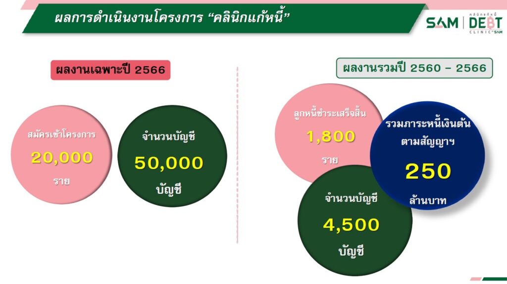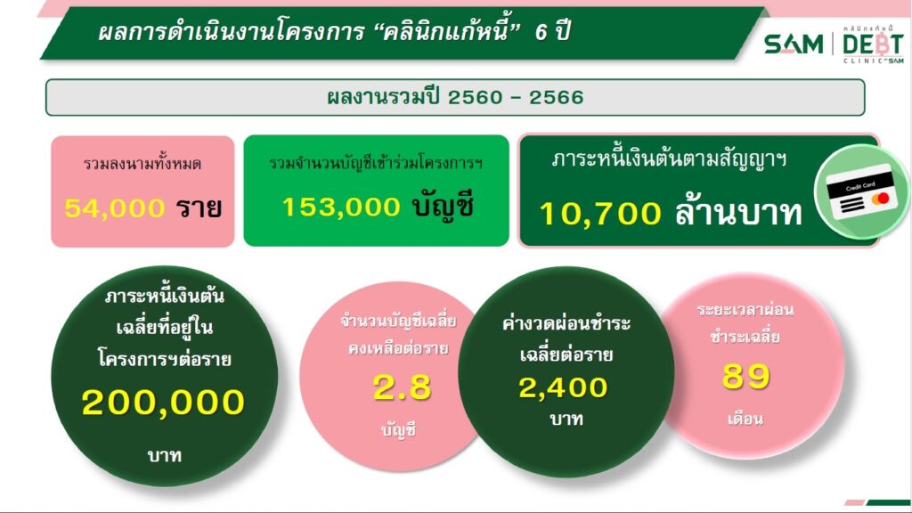 กรุงเทพฯ 22 ม.ค.-“คลินิกแก้หนี้ by SAM” เผยความสำเร็จปี 66 ลูกค้าหนี้เสียบัตรแห่สมัครทะลุเป้าหมาย ส่งผลยอดสะสมช่วยคนไทยแก้หนี้ ลดปัญหาหนี้ครัวเรือนของประเทศตลอด 6 ปีตั้งแต่เริ่มโครงการฯ สูงถึง 54,000 ราย คิดเป็นมูลหนี้รวมกว่า 10,000 ล้านบาท
