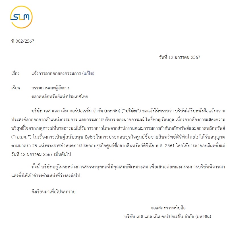 บริษัท เอส แอล เอ็ม คอร์ปอเรชั่น จำกัด (มหาชน) หรือ SLM แจ้งตลาดหลักทรัพย์ว่า บริษัทได้รับหนังสือแจ้งความประสงค์ลาออกจากตำแหน่งกรรมการ และกรรมการบริหาร ของนายอารมณ์ โพธิ์หาญรัตนกุล เนื่องจากต้องการแสดงความบริสุทธิ์ใจจากเหตุการณ์ที่นายอารมณ์ได้รับการกล่าวโทษจากสำนักงานคณะกรรมการกำกับหลักทรัพย์และตลาดหลักทรัพย์ (ก.ล.ต.) ในเรื่องการเป็นผู้สนับสนุน Bybit ในการประกอบธุรกิจศูนย์ซื้อขายสินทรัพย์ดิจิทัลโดยไม่ได้รับอนุญาตตามมาตรา 26 แห่งพระราชกำหนดการประกอบธุรกิจศูนย์ซื้อขายสินทรัพย์ดิจิทัล พ.ศ. 2561 โดยให้การลาออกมีผลตั้งแต่วันที่ 12 มกราคม 2567 เป็นต้นไป