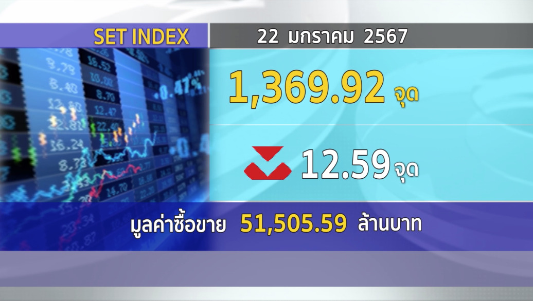 กทม. 22 ม.ค.- SET ปิดวันนี้ที่ 1,369.92 จุด ลดลง 12.59 จุด (-0.91%) มูลค่าการซื้อขาย 51,505.59 ล้านบาท