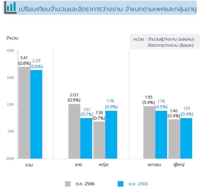 ส่วนผู้ที่อยู่นอกกำลังแรงงานหรือผู้ที่ไม่พร้อมทำงาน 17.92 ล้านคน ได้แก่ แม่บ้าน นักเรียน ยังเด็ก/ชรา ป่วย/พิการ เป็นต้น สำหรับผู้ว่างงาน 3.3 แสนคน อัตราการว่างงานร้อยละ 0.8 ทั้งนี้ เมื่อเปรียบเทียบกับเดือนตุลาคม 2566 ผู้ว่างงานลดลง 0.12 แสนคน (จาก 3.41 แสนคน เป็น 3.29 แสนคน)