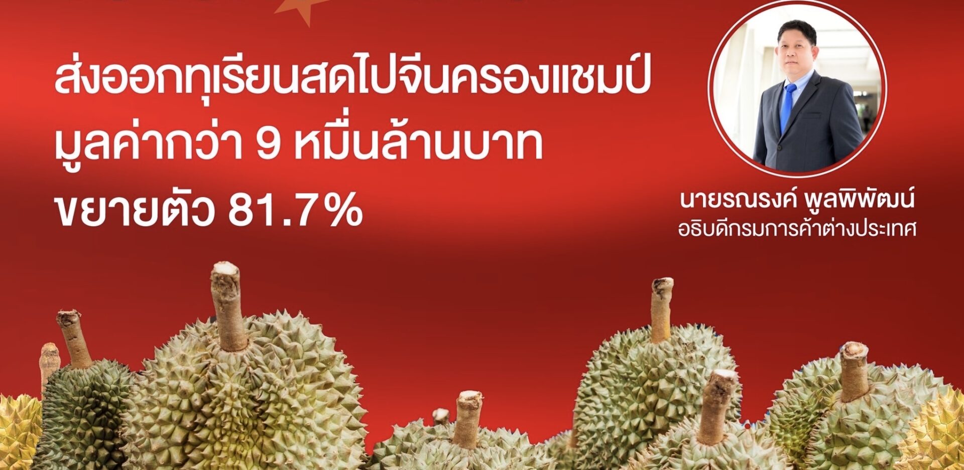 นนทบุรี 29 ม.ค.-อธิบดีกรมการค้าต่างประเทศเผยการค้าผ่านแดนไปจีน ปี 2566 ขยายตัวกว่า 44.1% โดยเฉพาะส่งออกทุเรียนสดไปจีนครองแชมป์ มูลค่ากว่า 9 หมื่นล้านบาท ขยายตัว 81.7%