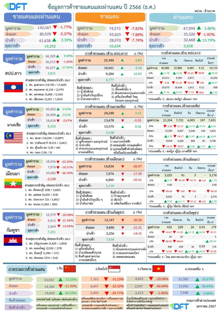 นายรณรงค์ พูลพิพัฒน์ อธิบดีกรมการค้าต่างประเทศ เปิดเผยตัวเลขการค้าชายแดนและการค้าผ่านแดน เดือนธันวาคม 2566 มีมูลค่าการค้ารวม 142,567 ล้านบาท เป็นการส่งออก 80,929 ล้านบาท และการนำเข้า 61,638 ล้านบาท โดยไทยได้ดุลการค้าในเดือนธันวาคม 2566 ทั้งสิ้น 19,292 ล้านบาท และเมื่อรวมทั้งปี 2566 การค้าชายแดนและผ่านแดนของไทยมีมูลค่าการค้ารวม 1,742,808 ล้านบาท ลดลง -2.6% เมื่อเทียบกับช่วงเดียวกันของปีก่อน เป็นการส่งออก 980,729 ล้านบาท (-4.6%) และการนำเข้า 762,079 ล้านบาท (+0.2%) โดยไทยได้ดุลการค้าทั้งปี 2566 รวม 218,650 ล้านบาท