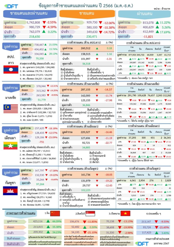 การค้าชายแดนกับประเทศเพื่อนบ้าน 4 ประเทศ ทั้งปี 2566 มีมูลค่าการค้ารวม 929,730 ล้านบาท แบ่งเป็นการส่งออก 580,100 ล้านบาท การนำเข้า 349,630 ล้านบาท และไทยได้ดุลการค้ารวมทั้งสิ้น 230,471 ล้านบาท โดยมาเลเซียเป็นประเทศคู่ค้าชายแดนอันดับ 1 ของไทย โดยในปี 2566 มีมูลค่าการค้ารวม 287,155 ล้านบาท รองลงมา ได้แก่ สปป.ลาว 260,512 ล้านบาท เมียนมา 220,327 ล้านบาท และกัมพูชา 161,736 ล้านบาท สินค้าส่งออกชายแดนสำคัญในปี 2566 ได้แก่ น้ำมันดีเซล 40,143 ล้านบาท น้ำมันสำเร็จรูปอื่นๆ 19,672 ล้านบาท และเครื่องคอมพิวเตอร์และอุปกรณ์ อื่นๆ 15,120 ล้านบาท โดยด่านศุลกากรที่มีมูลค่าการค้าชายแดนสูงสุด ได้แก่ ด่านศุลกากรสะเดา 226,254 ล้านบาท รองลงมาได้แก่ ด่านศุลกากรแม่สอด และด่านศุลกากรอรัญประเทศ มีมูลค่าการค้า 106,835 ล้านบาท และ 97,185 ล้านบาท ตามลำดับ