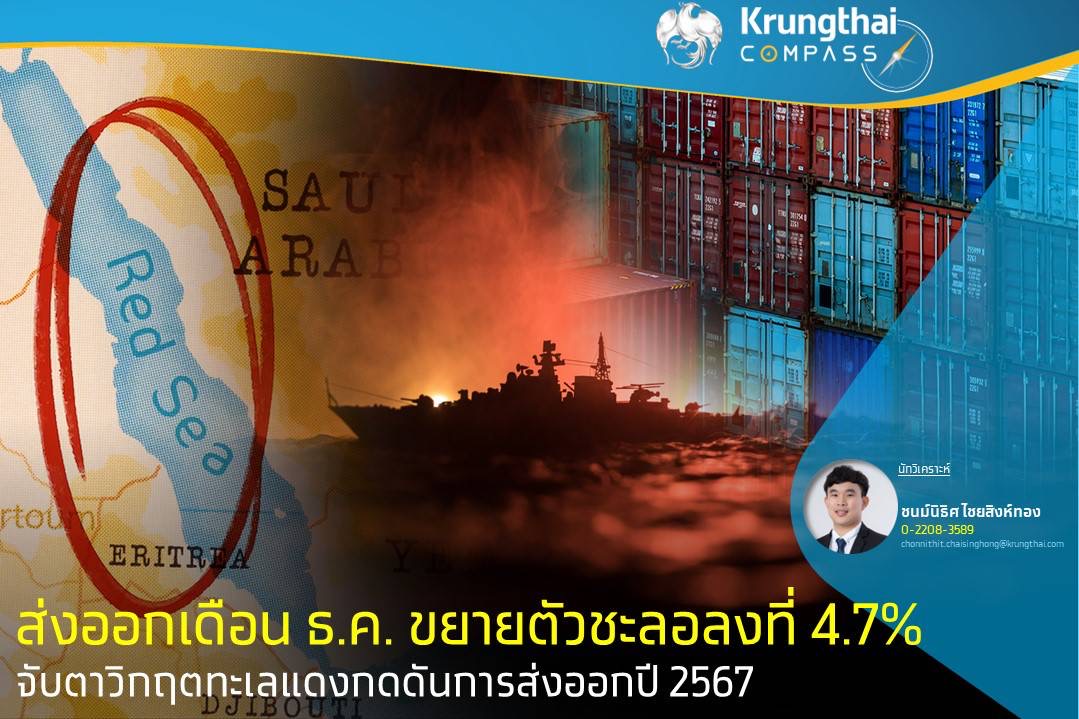 กรุงเทพฯ 29 ม.ค.-Krungthai COMPASS เผย มูลค่าการส่งออกเดือน ธ.ค. 2566 อยู่ที่ 22,791.6 ล้านดอลลาร์ฯ ขยายตัว 4.7% จับตาวิกฤตทะเลแดงกดดันการส่งออกปี 67 โดยเฉพาะสินค้าเกษตรและอาหาร เครื่องปรับอากาศ