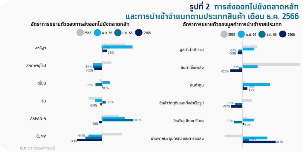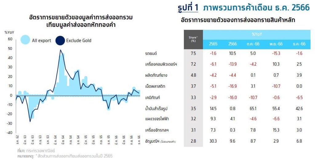 ศูนย์วิจัย Krungthai COMPASS เผย มูลค่าการส่งออกเดือน ธ.ค. อยู่ที่ 22,791.6 ล้านดอลลาร์ฯ ขยายตัว 4.7% เมื่อเทียบกับปี 2565 แต่ชะลอลงจากเดือนก่อนที่ขยายตัว 4.9% และต่ำกว่าการคาดการณ์ของตลาดที่ 6.0% โดยการส่งออกสินค้าอุตสาหกรรมและอุตสาหกรรมเกษตรขยายตัวได้ต่อเนื่องตามภาวะการค้าโลกที่ปรับตัวดีขึ้น อย่างไรก็ตามการส่งออกสินค้าเกษตรกลับมาหดตัว สำหรับการส่งออกทองคำเดือนนี้ขยายตัว 787.5% ทำให้เมื่อหักทองคำแล้ว มูลค่าส่งออกเดือนนี้ขยายตัว 3.0% ทั้งนี้การส่งออกปี 2566 ติดลบ 1.0%