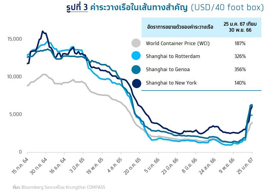ขณะที่ปัญหาการสู้รบในทะเลแดงที่ยืดเยื้อยังเป็นความเสี่ยงกดดันการส่งออก โดยเฉพาะการส่งออกสินค้าไปยังยุโรป การโจมตีเรือสินค้าที่ผ่านเส้นทางทะเลแดงโดยกลุ่มกบฏฮูตีที่ยังไม่ยุติ ส่งผลให้ค่าระวางเรือปรับเพิ่มขึ้นต่อเนื่อง เมื่อวันที่ 25 ม.ค. 2567 ค่าระวางเรือสำหรับตู้คอนเทนเนอร์ในเส้นทางเอเชียไปยังยุโรปใต้ และเอเชียไปยังยุโรปเหนือ ปรับเพิ่มขึ้นกว่า 300% จากปลายเดือน พ.ย. 2566 ทำให้ต้นทุนค่าขนส่งของผู้นำเข้าปรับสูงขึ้น ส่งผลให้ยุโรปมีแนวโน้มที่จะเปลี่ยนไปนำเข้าสินค้าจากประเทศอื่นที่มีต้นทุนค่าขนส่งที่ถูกกว่าการนำเข้าจากไทยหรือเอเชีย สินค้าสำคัญที่อาจได้รับผลกระทบ เช่น สินค้าเกษตรและอาหาร เครื่องปรับอากาศ หม้อแปลงไฟฟ้า อิเล็กทรอนิกส์ และรถจักรยานยนต์ เป็นต้น.–517-สำนักข่าวไทย