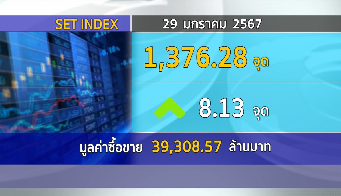 กทม. 29 ม.ค.-SET ปิดวันนี้ที่ 1,376.28 จุด เพิ่มขึ้น 8.13 จุด (+0.59%) มูลค่าซื้อขาย 39,308.57 ล้านบาท