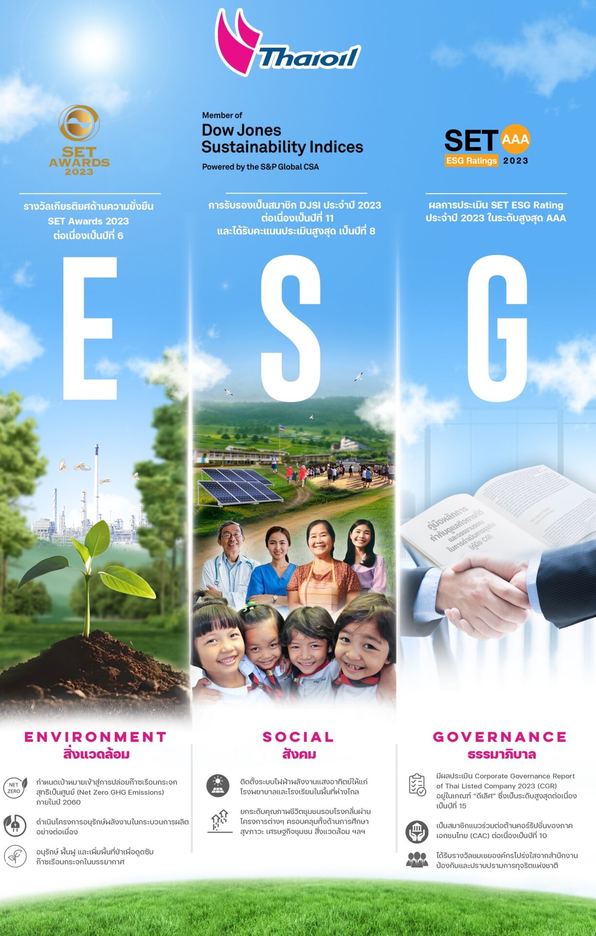โดยในปี 2566 ไทยออยล์เป็น 1 ใน 25 บริษัทจดทะเบียน ที่ทำคะแนนได้สูงสุดของทั้ง 4 เกณฑ์ประเมินด้านความยั่งยืนและด้านการกำกับดูแลกิจการที่ดีของบริษัทจดทะเบียนในตลาดหลักทรัพย์แห่งประเทศไทยรวมถึงในรอบปีที่ผ่านมา ไทยออยล์ได้รับรางวัล SET Awards 2023 กลุ่มรางวัล Sustainability Excellence ประเภทรางวัลเกียรติยศแห่งความสำเร็จ (Sustainability Awards of Honor 2023) ต่อเนื่องเป็นปีที่ 6 และได้รับผลประเมินหุ้นยั่งยืน SET ESG Ratings ประจำปี 2566 ระดับ AAA (ระดับสูงสุด) ในกลุ่มอุตสาหกรรมทรัพยากร จัดโดยตลาดหลักทรัพย์แห่งประเทศไทย ซึ่งจัดเป็นปีแรก (พัฒนามาจากการประเมิน “หุ้นยั่งยืน THSI” ซึ่งไทยออยล์ ได้รับการประเมินให้อยู่ใน THSI ต่อเนื่อง ตั้งแต่ปี 2558)