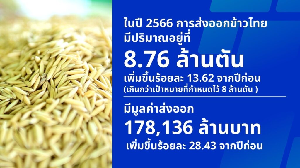 นายรณรงค์ พูลพิพัฒน์ อธิบดีกรมการค้าต่างประเทศ เปิดเผยสรุปยอดส่งออกในปี 2566 ส่งออกข้าวได้ 8.76 ล้านตัน เกินกว่าเป้าหมายที่กำหนดไว้ 8 ล้านตัน คิดเป็นมูลค่า 178,136 ล้านบาท (ประมาณ 5,144 ล้านเหรียญสหรัฐฯ) ปริมาณและมูลค่าส่งออกเพิ่มขึ้นจากปีก่อนร้อยละ 13.62 และร้อยละ 28.43 ตามลำดับ โดยกรมการค้าต่างประเทศร่วมกับสมาคมผู้ส่งออกข้าวไทยคาดการณ์ร่วมกันว่าการส่งออกข้าวไทยในปี 2567 จะมีปริมาณ 7.5 ล้านตัน