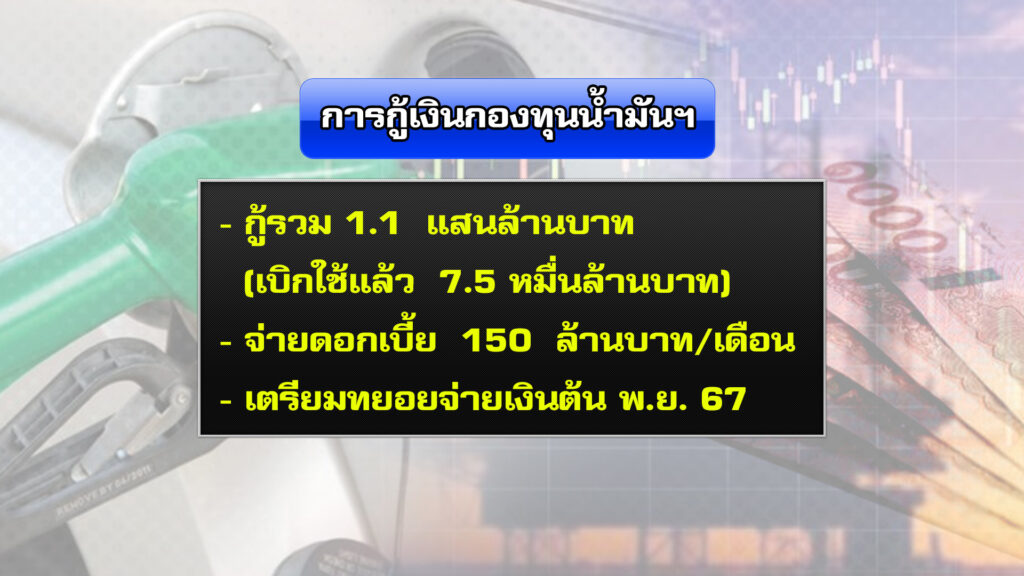 ในขณะที่ราคาตลาดโลกอยู่ในระดับสูงเพราะได้รับผลกระทบจากปัยหาความไม่สงบในหลายพื้นที่ทั้งตะวันออกกลางและ รัสเซีย-ยูเครน ทำให้เงินไหลออกจากกองทุนฯวันละกว่า 200 ล้านบาทหรือราว กว่า 7 พันล้านบาท/เดือน ส่วนใหญ่เป็นการดูแลดีเซลที่มียอดใช้สูงราว 68-70 ล้านลิตร/วัน โดยฐานะกองทุนฯ ณ วันที่ 28 มกราคม 2567 ติดลบ 84,349 ล้านบาท มีภาระเงินกู้ 1.1 แสนล้านบาท (เบิกมาใช้เสริมสภาพคล่องแล้ว 7.5 หมื่นล้านบาท ) โดยในส่วนเงินกู้ ขณะนี้จ่ายเพียงดอกเบี้ยราว 150 ล้านบาท/เดือน และจะเริ่มทยอยใช้หนี้เงินต้นในเดือน พ.ย. 67