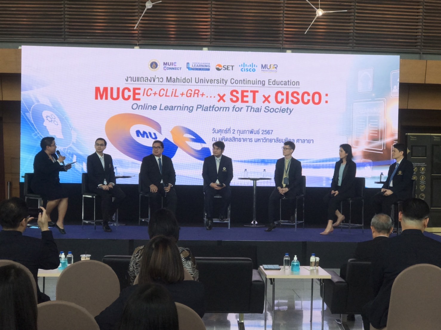 กรุงเทพฯ 2 ก.พ.-มหาวิทยาลัยมหิดล โดยศูนย์ส่งเสริมการเรียนรู้แบบบูรณาการชีวิต วิทยาลัยนานาชาติและบัณฑิตวิทยาลัย ร่วมกับ ตลาดหลักทรัพย์แห่งประเทศไทย และ Cisco Systems ร่วมเปิดตัวระบบสนับสนุนการเรียนรู้ “MUCE and SET and CISCO (เอ็มยูซีอี แอนด์ เซ็ท แอนด์ ซิสโก้):Online Learning Platform for Thai Society (ออนไลน์ เลิร์นนิ่ง แพลทฟอร์ม ฟอร์ ไทย โซไซตี้)