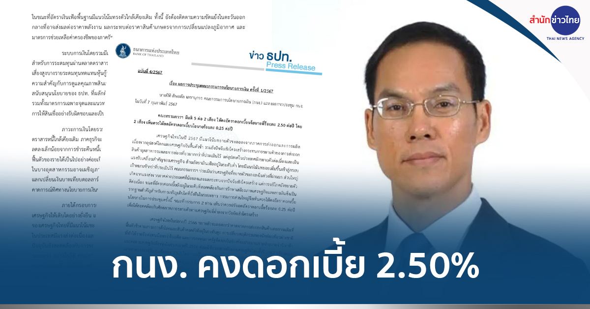 นายปิติ ดิษยทัต เลขานุการคณะกรรมการนโยบายการเงิน (กนง.) แถลงผลการประชุม กนง. ในวันที่ 7 กุมภาพันธ์ 2567 คณะกรรมการฯ มีมติ 5 ต่อ 2 เสียง ให้คงอัตราดอกเบี้ยนโยบายที่ร้อยละ 2.50 ต่อปี โดย 2 เสียง เห็นควรให้ลดอัตราดอกเบี้ยนโยบายร้อยละ 0.25 ต่อปี