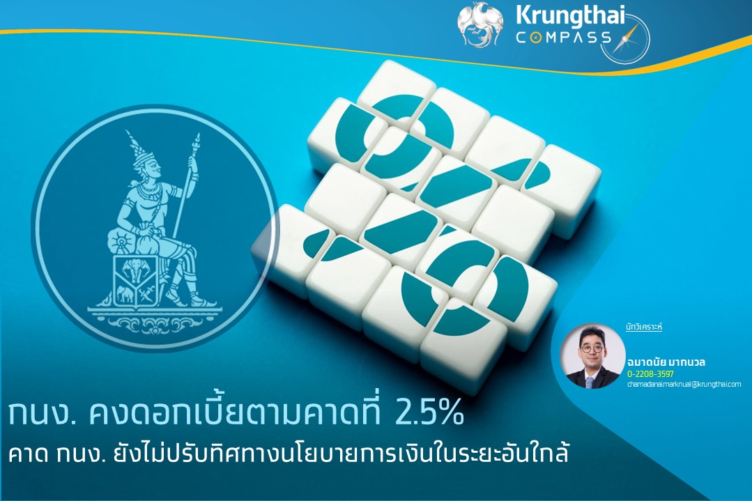“ประเมินว่า กนง. จะยังไม่เร่งปรับทิศทางของการดำเนินนโยบายการเงินและจำเป็นต้องรอความชัดเจนของข้อมูลต่างๆในระยะต่อไปเนื่องจากเศรษฐกิจยังอยู่ในทิศทางขยายตัว ขณะที่มีความเสี่ยงซึ่งอาจกดดันให้เงินเฟ้อเร่งตัวขึ้นได้ในอนาคต อีกทั้งยังต้องติดตามการปรับทิศทางนโยบายการเงินของธนาคารกลางหลักในต่างประเทศ นอกจากนี้ กนง. ยังสื่อสารว่าการลดดอกเบี้ยไม่สามารถแก้ “ปัญหาเชิงโครงสร้าง” ได้ คาดว่า กนง. จะคงอัตราดอกเบี้ยนโยบายไว้ที่ร้อยละ 2.50 ต่อไป ส่วนการลดอัตราดอกเบี้ยนั้นมีความเป็นไปได้มากขึ้นและจำเป็นต้องติดตามท่าที กนง. และพัฒนาการทางเศรษฐกิจต่อไปอย่างใกล้ชิด” Krungthai COMPASS ระบุ