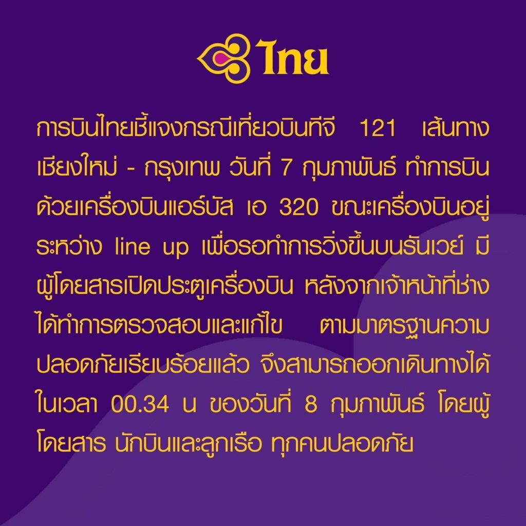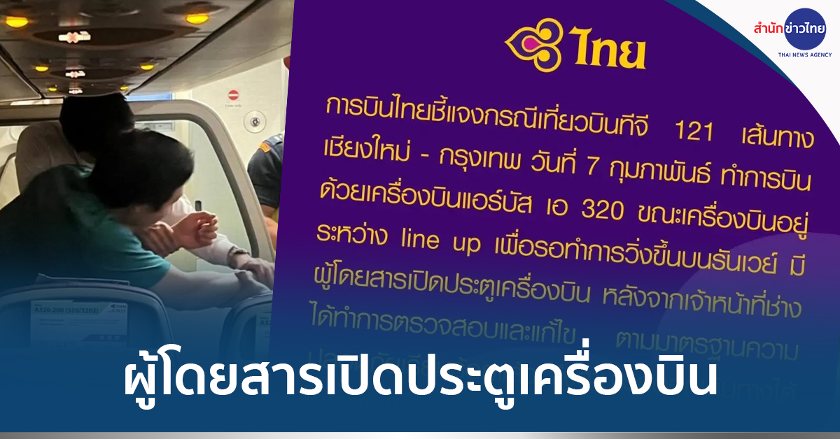 กรุงเทพฯ 8 ก.พ. – การบินไทยชี้แจงกรณีเที่ยวบินทีจี 121 เส้นทางเชียงใหม่-กรุงเทพ วันที่ 7 ก.พ. โดยระบุว่า มีผู้โดยสารเปิดประตูเครื่องบินระหว่างรอวิ่งขึ้นบนรันเวย์