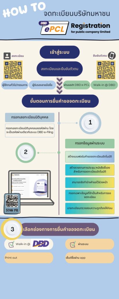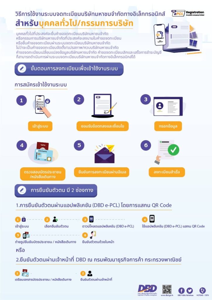 ทั้งนี้ ระยะต่อไป กรมฯ เตรียมเปลี่ยนแปลงการให้บริการจดทะเบียนบริษัทมหาชนเป็นผ่านระบบออนไลน์ e-PCL เพียงช่องทางเดียว เพื่อให้ภาคธุรกิจสามารถนำข้อมูลที่มีการจดทะเบียนฯ ไปใช้งานได้แบบเรียลไทม์ ลดข้อจำกัดด้านการรอคอยเอกสาร และเพิ่มประสิทธิภาพ ขีดความสามารถทางการแข่งขัน ส่งผลให้การบริหารจัดการธุรกิจมีความคล่องตัวและเกิดประสิทธิภาพสูงสุด และขอเชิญชวนกรรมการผู้มีอำนาจของบริษัทมหาชนจำกัดเร่งลงทะเบียนขอรับ Username & Password พร้อมยืนยันตัวตนให้เรียบร้อย เพื่อทำธุรกรรมการจดทะเบียนฯ ได้ทันที
