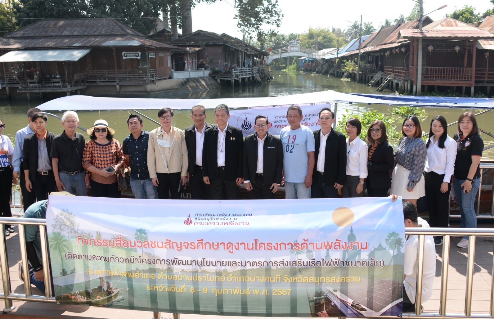 สมุทรสงคราม 9 ก.พ.- พพ.ลงพื้นที่ติดตามความก้าวหน้าโครงการพัฒนานโยบายและมาตรการส่งเสริมเรือไฟฟ้าขนาดเล็ก จังหวัดสมุทรสงคราม ซึ่งช่วยลดค่าพลังงานได้ถึง 8.15 บาท/กิโลเมตร ส่งเสริมการท่องเที่ยวสีเขียว (Green tourism)พร้อมเดินหน้าดัดแปลงเป็นเรือไฟฟ้าให้ได้ครึ่งหนึ่งของทั้งประเทศ (1,612 ลำ) ซึ่งจะลดค่าใช้จ่ายด้านพลังงานได้กว่า 88 ล้านบาท/ปี