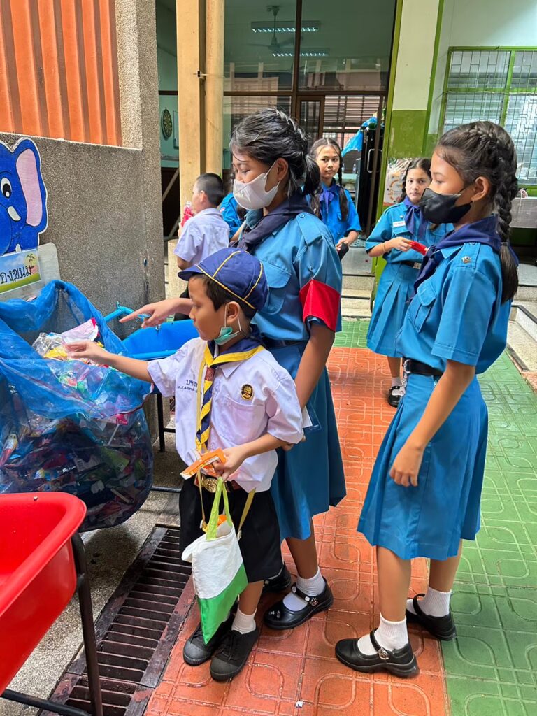 บางจากฯ ร่วมกับ SCGC ริเริ่มโครงการ “รักษ์ ปัน สุข จูเนียร์” ในปี 2564 เพื่อเป็นต้นแบบการบริหารจัดการขยะในโรงเรียนและชุมชนตามหลักเศรษฐกิจหมุนเวียน แก่โรงเรียนรอบโรงกลั่นน้ำมันบางจากฯ และโรงเรียนในเครือข่ายของมูลนิธิใบไม้ปันสุข โดยร่วมพัฒนา 8 ฐานเรียนรู้ด้านการจัดการของเสียในสถานศึกษา เพื่อส่งเสริมหลักเศรษฐกิจหมุนเวียนให้เยาวชนในโรงเรียน ซึ่งโรงเรียน 17 แห่ง ในเครือข่ายมูลนิธิใบไม้ปันสุขที่ร่วมโครงการสามารถจัดการของเสียได้ถึง 9,060 กิโลกรัม (ระหว่างเดือนพฤษภาคม 2565 ถึงเดือนกรกฎาคม 2566) และสามารถลดปริมาณก๊าซเรือนกระจกได้ 39.2 ตันคาร์บอนไดออกไซด์เทียบเท่า