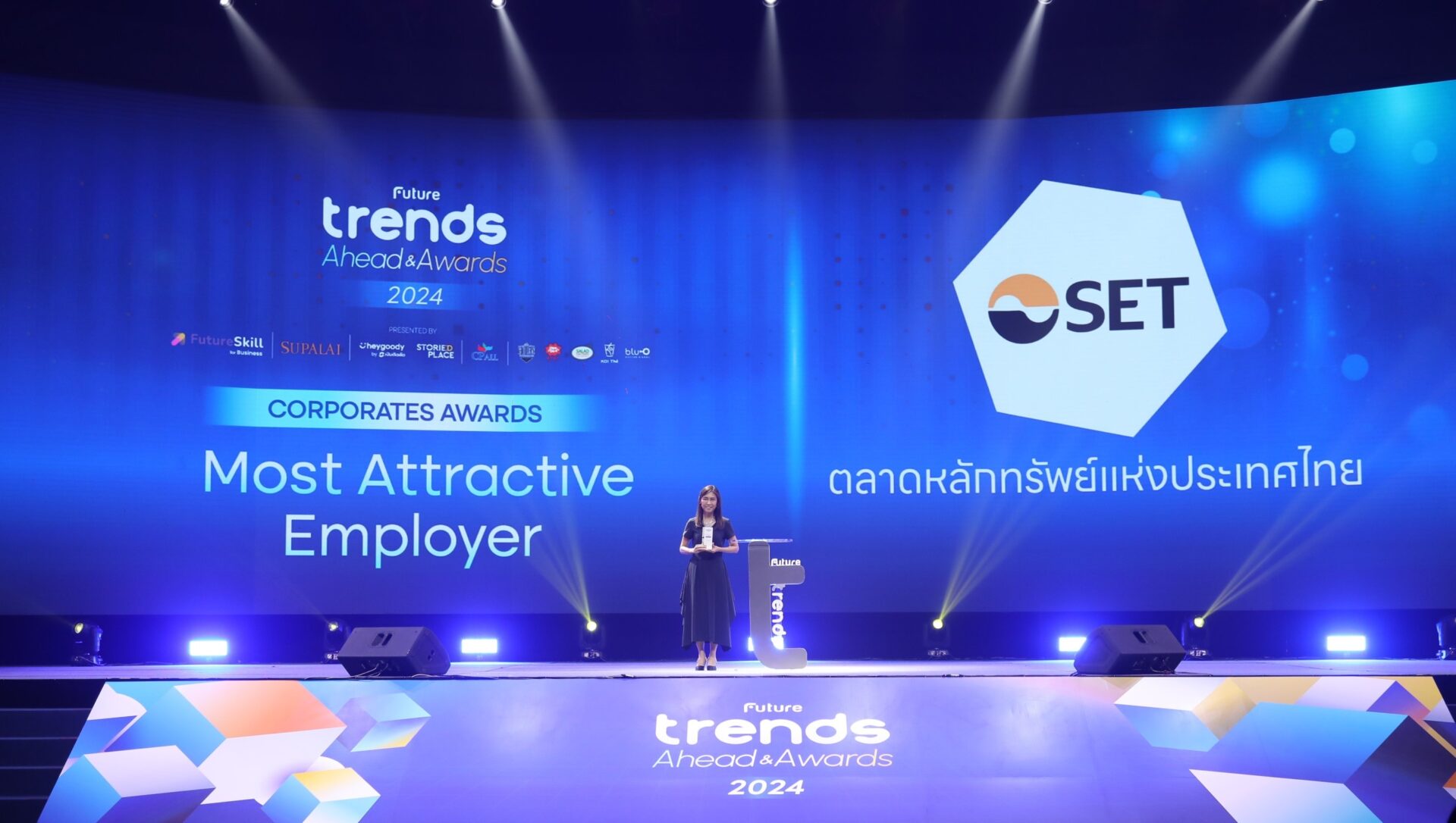 ตลาดหลักทรัพย์แห่งประเทศไทยคว้า 2 รางวัลจากงานประกาศรางวัลสุดยอดผู้นำนวัตกรรมและเทรนด์แห่งปี – Future Trends Ahead & Awards 2024 โดยได้รับรางวัล “Most Attractive Employer” ติด 1 ใน 10 องค์กรที่ดึงดูดใจพนักงานที่สุด ประเภทรางวัลจากการโหวตของผู้มีอายุมากกว่า 30 ปี และรางวัลจากการโหวตของผู้มีอายุน้อยกว่า 30 ปี สะท้อนการเป็นแบรนด์แห่งอนาคตที่สร้างสรรค์นวัตกรรมใหม่ๆ ก่อให้เกิดคุณค่าต่อสังคมในวงกว้าง ซึ่งเป็นองค์กรที่พนักงานแสวงหาและอยากร่วมงานด้วย