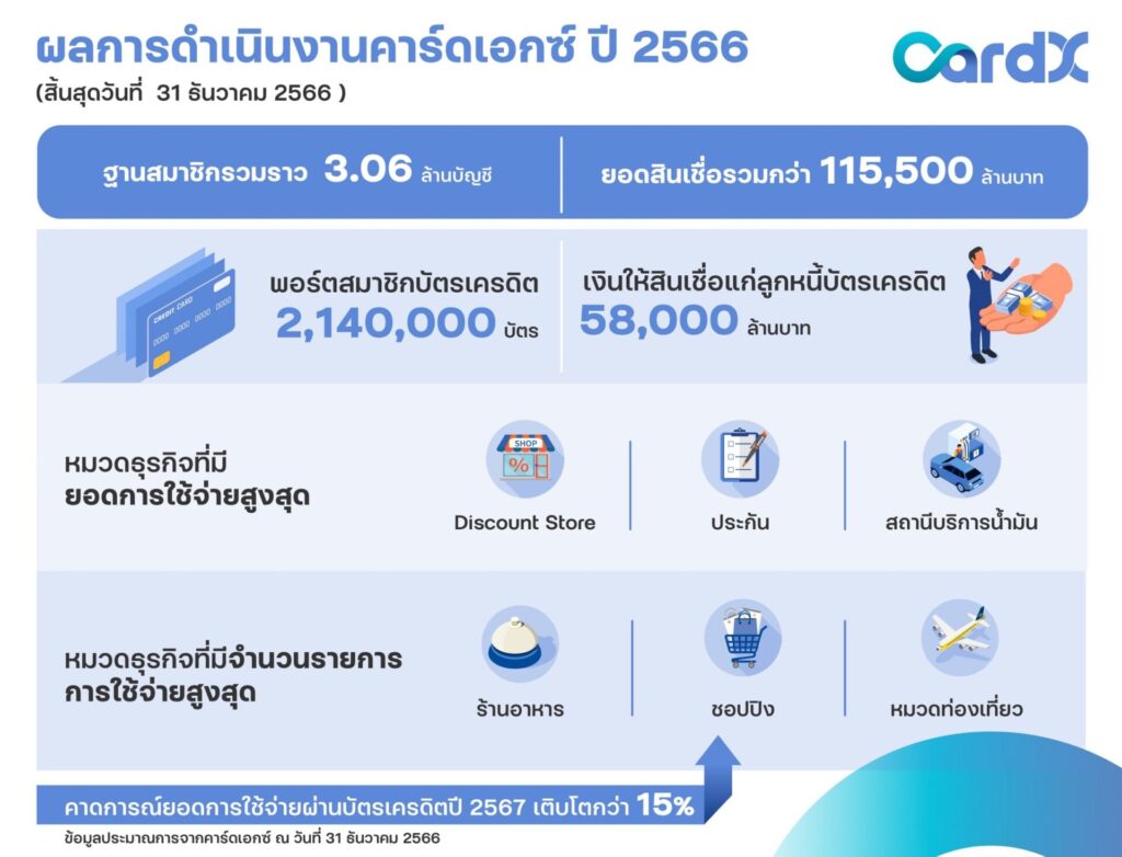 ผลการดำเนินงานของคาร์ดเอกซ์ ณ วันที่ 31 ธันวาคม 2566 บริษัทมียอดสินเชื่อรวมกว่า 115,500 ล้านบาท มีฐานสมาชิกรวมราว 3.06 ล้านบัญชี พอร์ตสินเชื่อรวม 115,500 ล้านบาท โดยแบ่งเป็นพอร์ตสมาชิกบัตรเครดิต 2,140,000 บัตร มูลค่าสินเชื่อแก่ลูกหนี้บัตรเครดิต 58,000 ล้านบาท สัดส่วนของพอร์ตสมาชิกบัตรเครดิตและสมาชิกสินเชื่อบุคคล 50:50 โดยหมวดธุรกิจที่มียอดการใช้จ่ายสูงสุด ได้แก่ หมวดไฮเปอร์มาร์เก็ต, ประกัน และสถานีบริการน้ำมัน และหมวดธุรกิจที่มีจำนวนรายการการใช้จ่ายสูงสุดได้แก่ หมวดร้านอาหาร หมวดชอปปิง และหมวดท่องเที่ยว