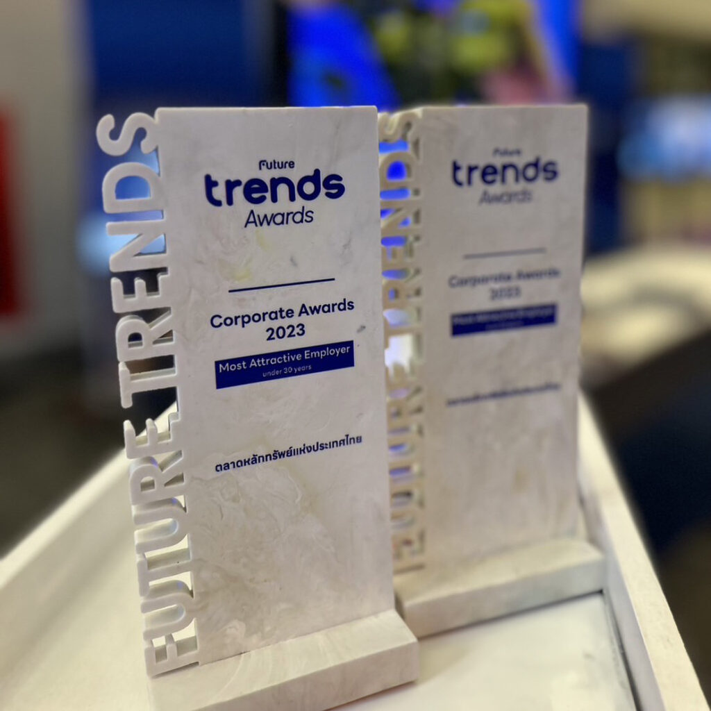 ตลาดหลักทรัพย์แห่งประเทศไทยคว้า 2 รางวัลจากงานประกาศรางวัลสุดยอดผู้นำนวัตกรรมและเทรนด์แห่งปี – Future Trends Ahead & Awards 2024 โดยได้รับรางวัล “Most Attractive Employer” ติด 1 ใน 10 องค์กรที่ดึงดูดใจพนักงานที่สุด ประเภทรางวัลจากการโหวตของผู้มีอายุมากกว่า 30 ปี และรางวัลจากการโหวตของผู้มีอายุน้อยกว่า 30 ปี สะท้อนการเป็นแบรนด์แห่งอนาคตที่สร้างสรรค์นวัตกรรมใหม่ๆ ก่อให้เกิดคุณค่าต่อสังคมในวงกว้าง ซึ่งเป็นองค์กรที่พนักงานแสวงหาและอยากร่วมงานด้วย โดยมีนางสาวจิตติยา ธรรมสรณ์ ผู้ช่วยผู้จัดการ หัวหน้าสายงานทรัพยากรบุคคลและพัฒนาองค์กร ตลาดหลักทรัพย์แห่งประเทศไทย เป็นตัวแทนรับมอบ