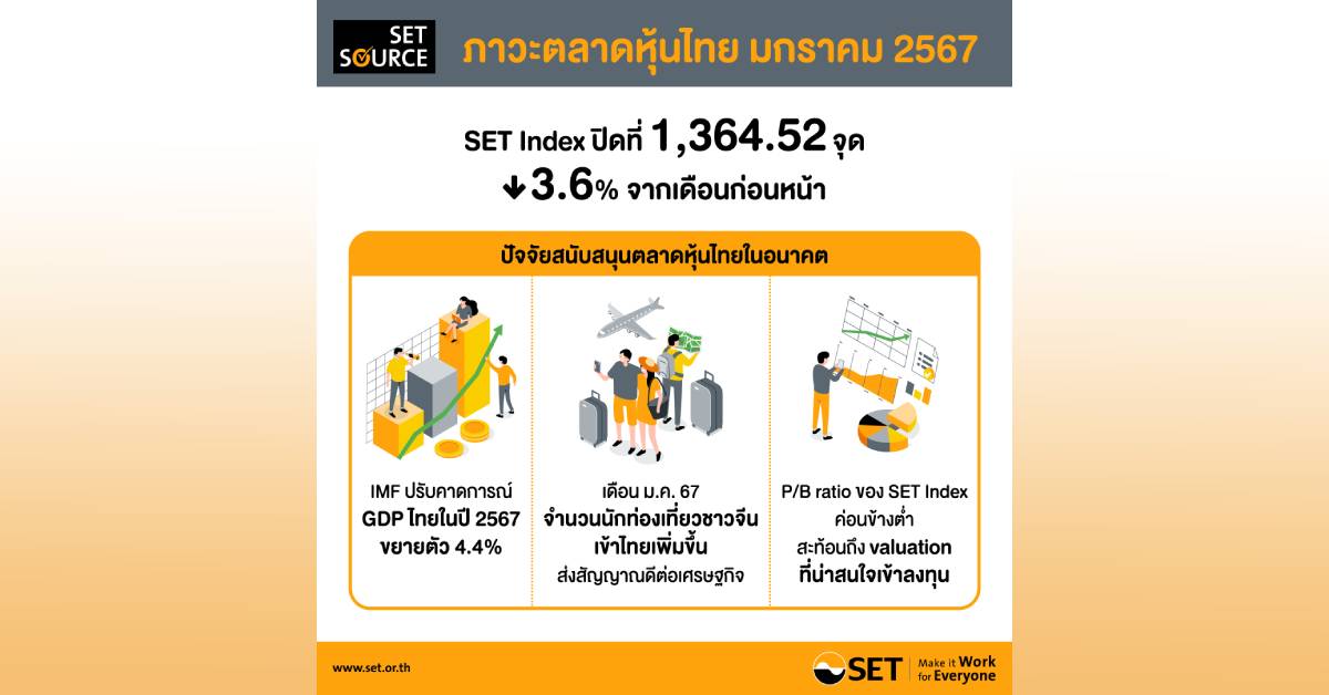 • ณ สิ้นเดือนมกราคม 2567 SET Index ปิดที่ 1,364.52 จุด ปรับลดลง 3.6% จากเดือนก่อนหน้า โดยให้ผลตอบแทนใกล้เคียงกับค่าเฉลี่ยของภูมิภาค