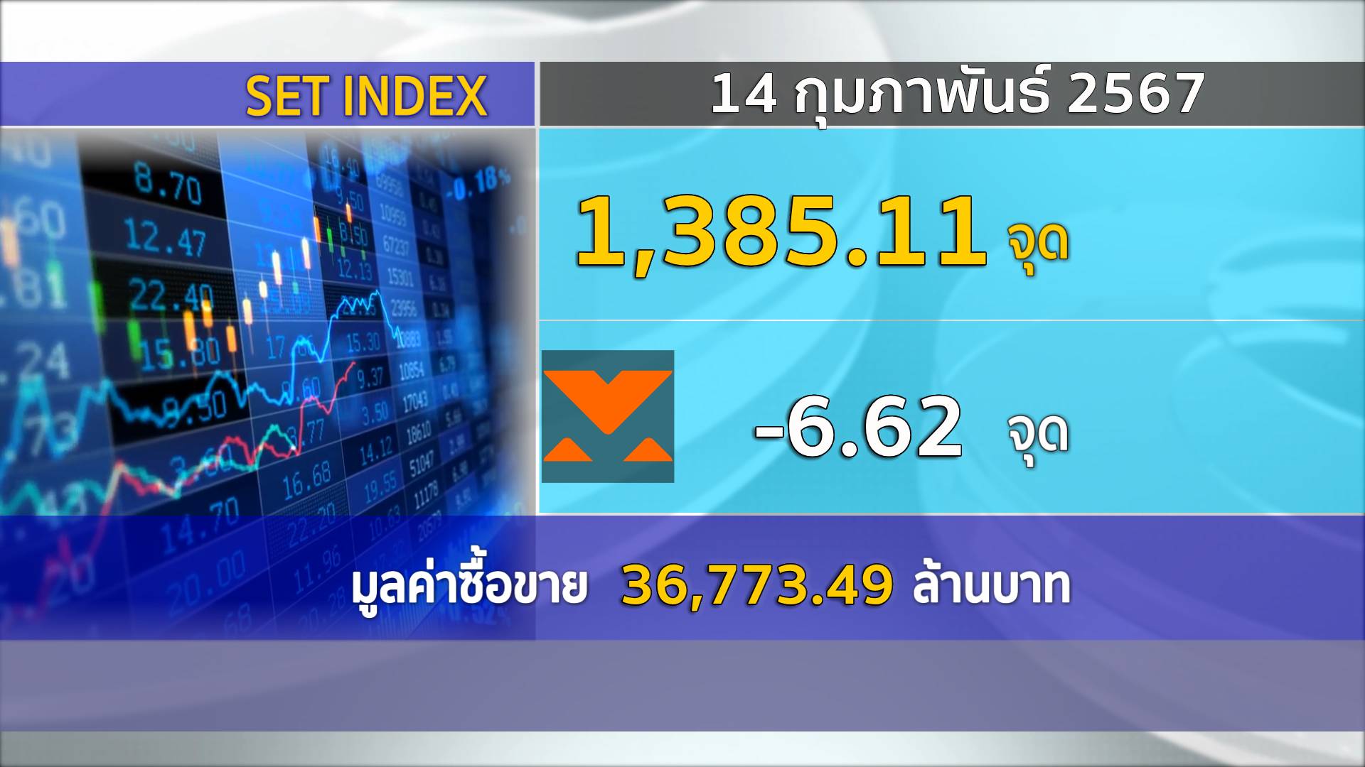 กทม. 14 ก.พ.-SET ปิดวันนี้ที่ 1,385.11 จุด ลดลง 6.62 จุด (-0.48%) มูลค่าซื้อขาย 36,773.49 ล้านบาท