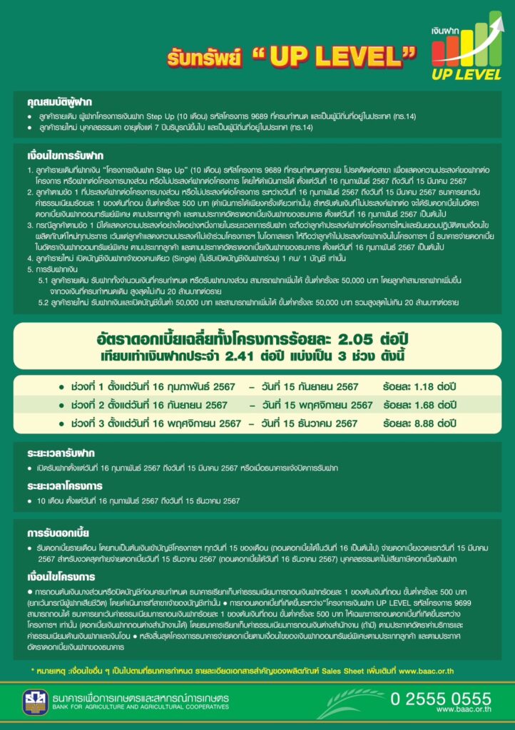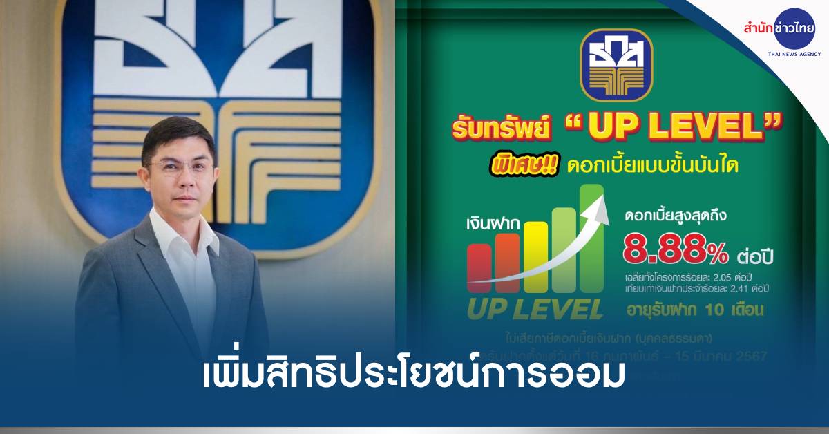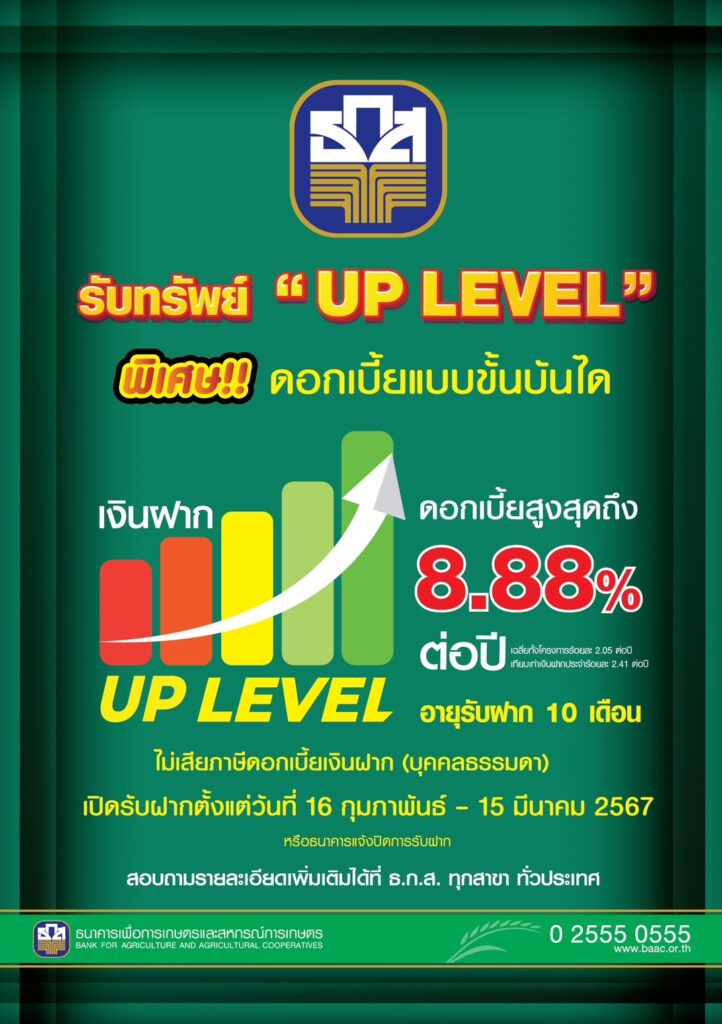กรุงเทพฯ 14 ก.พ.-ธ.ก.ส. เพิ่มสิทธิประโยชน์การออมกับ “เงินฝาก UP LEVEL” ฝากขั้นต่ำ 50,000 บาท รับดอกเบี้ยสูงสุด 8.88% ต่อปี