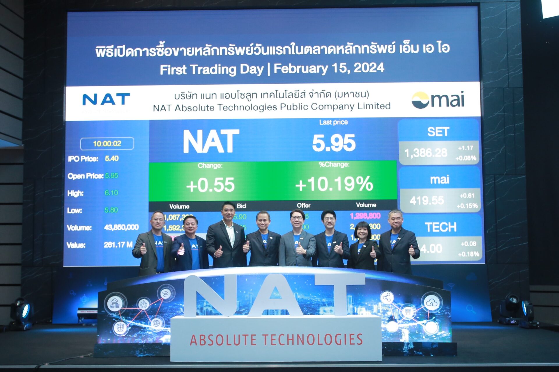 นายประพันธ์ เจริญประวัติ ผู้จัดการตลาดหลักทรัพย์ เอ็ม เอ ไอ พร้อมด้วย นายสุธี อภิชนรัตนกร ประธานเจ้าหน้าที่บริหาร บมจ. แนท แอบโซลูท เทคโนโลยีส์ ร่วมพิธีเปิดการซื้อขายวันแรกในตลาดหลักทรัพย์ เอ็ม เอ ไอ ของ บมจ. แนท แอบโซลูท เทคโนโลยีส์ ผู้ให้คำปรึกษา ออกแบบ จัดหา จำหน่ายอุปกรณ์พร้อมติดตั้ง และรับเหมาวางระบบเทคโนโลยีสารสนเทศและการสื่อสารอย่างครบวงจร ในวันที่ 15 กุมภาพันธ์ 2567 มูลค่าหลักทรัพย์ ณ ราคา IPO 1,771.20 ล้านบาท โดยใช้ชื่อย่อในการซื้อขายหลักทรัพย์ว่า “NAT” .-511-สำนักข่าวไทย