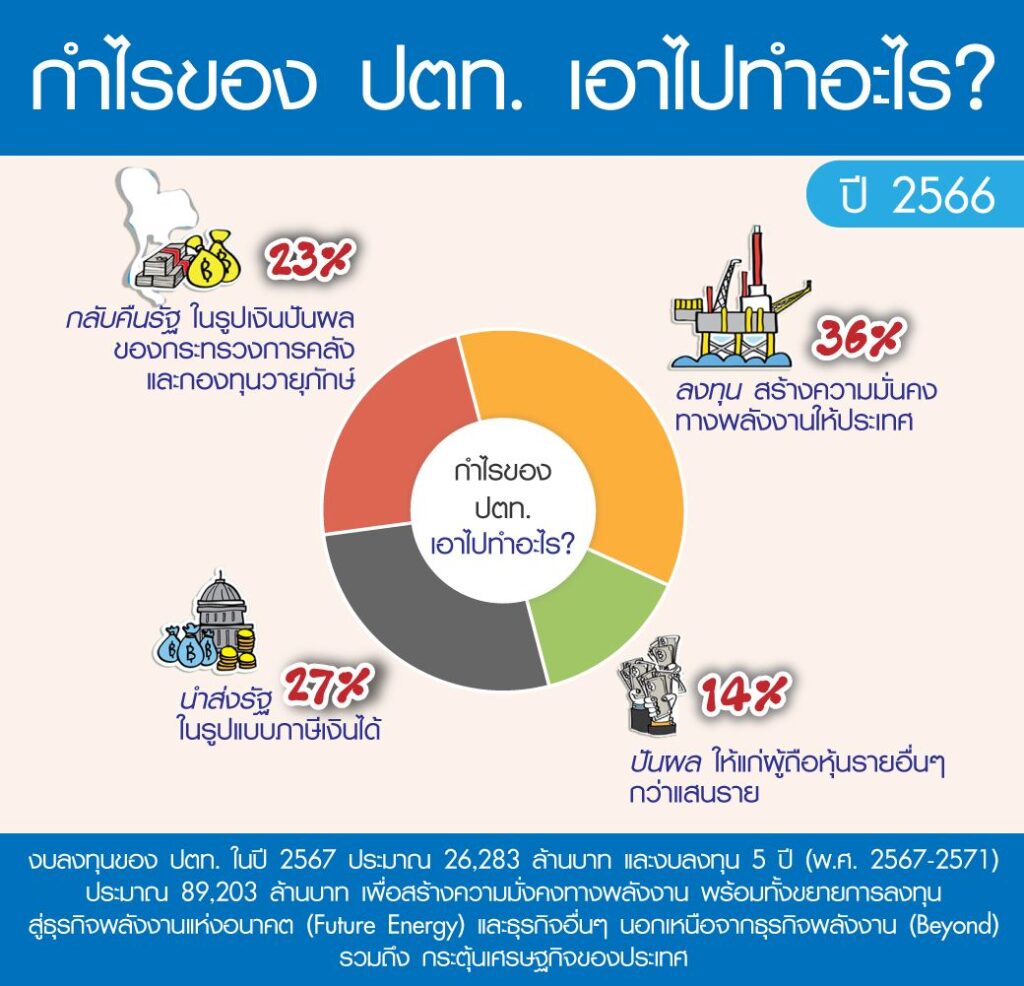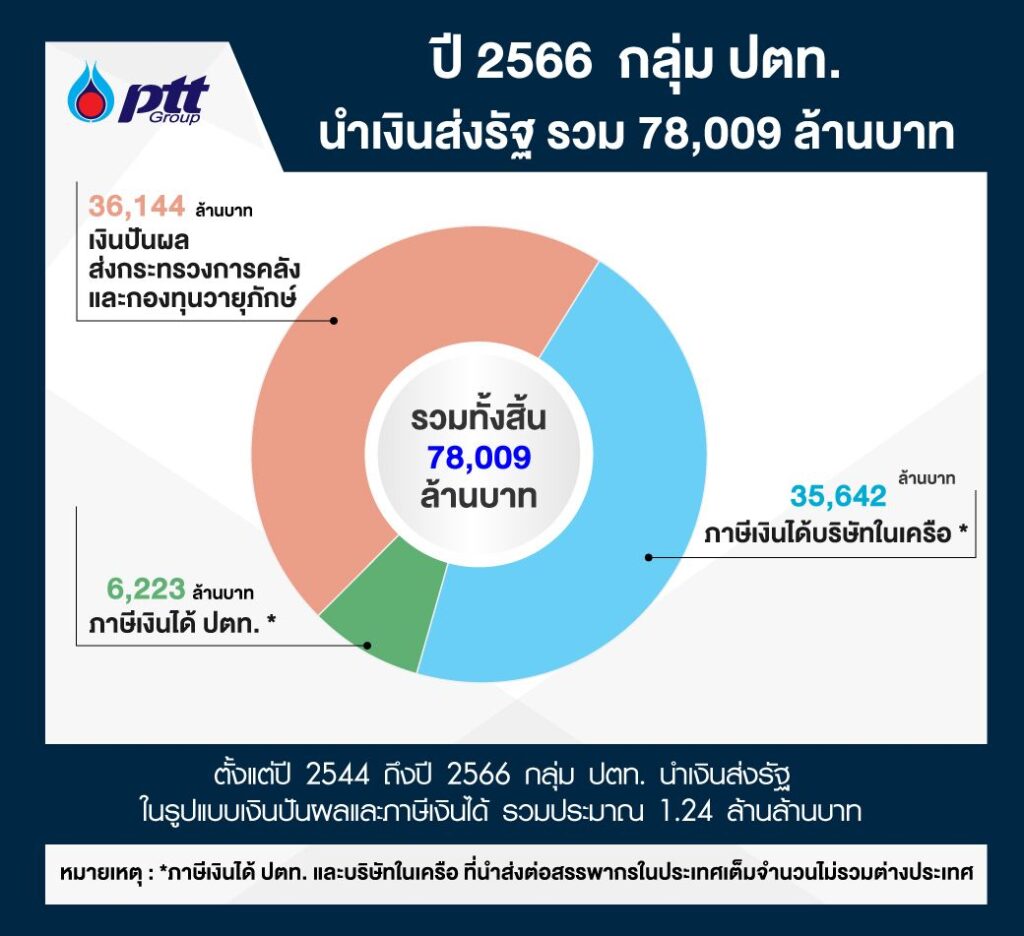 ทั้งนี้คณะกรรมการ ปตท. มีมติจ่ายเงินปันผลสำหรับผลประกอบการปี 2566 ในอัตราหุ้นละ 2.00 บาท โดยได้จ่ายปันผลระหว่างกาลไปแล้วในอัตราหุ้นละ 0.80 บาท เมื่อกันยายน 2566 คงเหลือเงินปันผลที่จะจ่ายอีกในอัตราหุ้นละ 1.20 บาท ซึ่งกระทรวงการคลังในฐานะผู้ถือหุ้นใหญ่และกองทุนวายุภักษ์รับปันผลรวมประมาณ 3.6 หมื่นล้านบาท และเมื่อรวมกับภาษีเงินได้นิติบุคคลของ ปตท. และบริษัทในเครือ อีกประมาณ 4.2 หมื่นล้านบาท รวมกลุ่ม ปตท. นำส่งรายได้จากการดำเนินธุรกิจปี 2566 ให้กับรัฐแล้วประมาณ 7.8 หมื่นล้านบาท