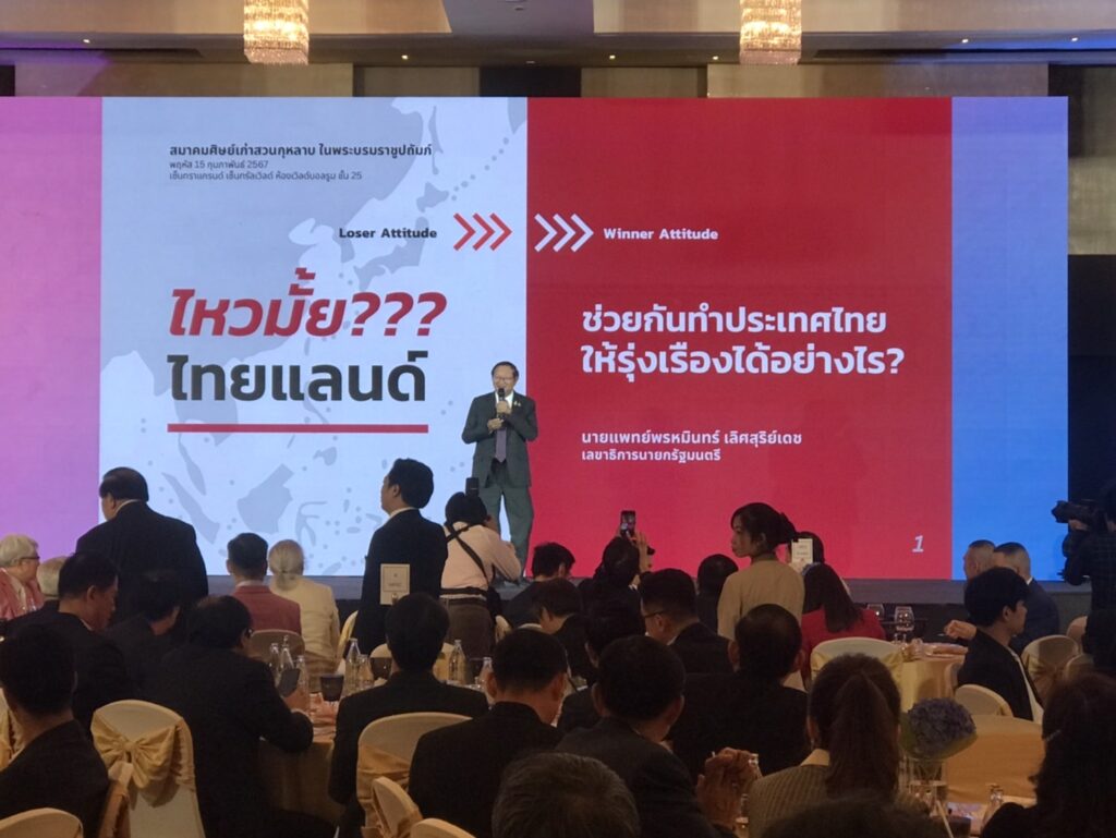 น.พ.พรหมินทร์ เลิศสุริย์เดช เลขาธิการนายกรัฐมนตรี ในฐานะศิษย์เก่า OSK 87 กล่าวว่า จุดแข็งของประเทศไทย เราอยู่ในสภาพภูมิศาสตร์ที่นิ่งที่สุดและเชื่อมกับประเทศที่มีประชากรมากมาย เช่น อาเซียนประชากร 600-700 ล้านคน จีนประชากร 1,400 ล้านคน แต่เราต้องเดินนโยบายให้ถูกต้อง ประเทศเราต้องไม่เป็นศัตรูกับใครเพราะการเมืองที่แท้จริงคือเรื่องเศรษฐกิจ โดยสถานการณ์ประเทศไทยขณะนี้คือ “กบต้ม”หมายถึง การปรับตัวได้ตลอดเวลา ที่ผ่านมาไทยเรามีอัตราขยายตัวทางเศรษฐกิจ ปี 1994-1996 ขยายตัว 7.5% ปี 1999-2007 ขยายตัว 5.2% ปี 2010-2019 ขยายตัว 3.6% โดยเศรษฐกิจไทยถูกซ้ำเติมด้วยวิกฤติโควิด ปัจจุบันยังฟื้นตัวช้ากว่าประเทศอื่นในภูมิภาค ประชาชนจำนวนมากยังลำบาก รายได้ยังไม่ฟื้นตัว คนรวยมีเพียง 10% ของประชากรทั้งประเทศ คนจนมีมากกว่า 50% ของประชากรทั้งประเทศ ถ้าเป็นอย่างนี้ เราจะต้องมีการกระตุ้นเศรษฐกิจด้วยโครงการดิจิทัล วอลเล็ต ที่ผ่านมานายกรัฐมนตรีของไทย ทำงานหนักมากทั้งในและต่างประเทศเพื่อฟื้นความสัมพันธ์ระหว่างประเทศรวมทั้งติดต่อภาคธุรกิจที่เป็นของจริง อย่างไรก็ตามจากสงครามการค้าระหว่างสหรัฐอเมริกากับจีน ก็เกิดผลดีกับไทย เมื่อสหรัฐอเมริกา ต้องการเลือกประเทศในอาเซียนเพื่อพบปะพูดคุยกับจีน โดยจีนเสนอให้พบกันที่ประเทศไทย เพราะจีนไว้ใจไทยมากที่สุด ทั้งนี้ไทยเรายังมีศักยภาพที่ถูกละเลย ความสามารถที่ซ่อนเร้น คือ ภาคการท่องเที่ยว การบิน การขนส่ง การเกษตร อาหาร อุตสาหกรรมยานยนต์ไฟฟ้า และเศรษฐกิจดิจิทัล สำหรับปัจจัยสำคัญที่จะทำให้ประเทศไทย ไปต่อได้และไปไหวตามหัวข้อปาฐกถาในครั้งนี้ มีอยู่ 3 ปัจจัยสำคัญ คือ 1.ทิศทางเศรษฐกิจที่ดี 2.โครงสร้างพื้นฐานและกฎหมายทางการค้า และ 3.Human Capital เราต้องพัฒนาคนของเรา ซึ่งถ้าถามขณะนี้ว่า ไหวมั้ย..ไทยแลนด์ ขอตอบว่า เราจะต้องทำให้ไหว