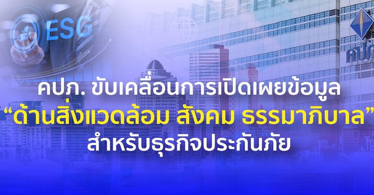 สำหรับแนวทางการพัฒนากรอบการกำกับดูแลแนวทางการเปิดเผยข้อมูลด้าน ESG ที่ผ่านมาได้มีการศึกษาแนวทางการกำกับดูแลจากทั้งมาตรฐานสากล เช่น มาตรฐานการกำกับดูแลธุรกิจประกันภัยสากล (International Association of Insurance Supervisors: IAIS) หลักการประกันภัยที่ยั่งยืน (Principles for Sustainable Insurance) มาตรฐานการเปิดเผยข้อมูลที่เกี่ยวข้องกับสภาพภูมิอากาศ (Task Force on Climate-related Financial Disclosures: TCFD) มาตรฐานการรายงานความยั่งยืน (Global Reporting Initiative Standards: GRI) และแนวทางการกำกับดูแลเรื่องการเปิดเผยข้อมูลของหน่วยงานในประเทศ เช่น แบบแสดงรายการข้อมูลประจำปี (56-1 One report) และคู่มือการรายงานความยั่งยืนสำหรับบริษัทจดทะเบียนจนได้ผลการศึกษาและพัฒนาเป็นกรอบแนวทาง เรื่อง การเปิดเผยข้อมูลด้านสิ่งแวดล้อม สังคม และธรรมาภิบาลของบริษัทประกันชีวิต และบริษัทประกันวินาศภัย ซึ่งประกอบด้วยแนวทางการเปิดเผยข้อมูลใน 3 มิติสำคัญ คือ มิติแรก แนวทางการเปิดเผยข้อมูลในมิติด้านสิ่งแวดล้อม (Environment) โดยมีหัวข้อเกี่ยวกับการเปิดเผยข้อมูลในเรื่องของการบริหารจัดการสิ่งแวดล้อม และการเปลี่ยนแปลงสภาพภูมิอากาศ