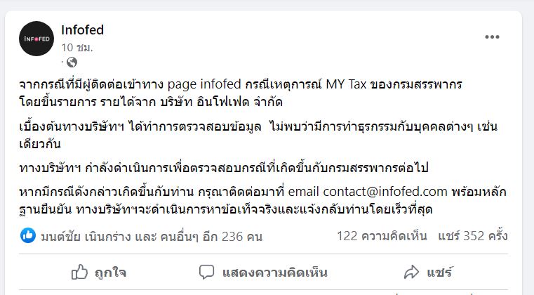ขณะที่บริษัท อินโฟเฟด ซึ่งถูกระบุถึงในภาพ โพสต์เฟซบุ๊กชี้แจง ระบุเบื้องต้นบริษัทฯ ได้ตรวจสอบข้อมูล ไม่พบว่ามีการทำธุรกรรมกับบุคคลต่างๆ เช่นเดียวกัน และกำลังตรวจสอบกรณีที่เกิดขึ้นกับกรมสรรพากรต่อไป