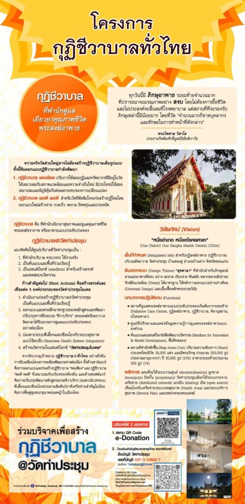 ทุกวันนี้มีภิกษุอาพาธ ระยะท้ายจำนวนมาก ที่ปรารถนาจะมรณภาพอย่างสงบ โดยไม่ต้องการยื้อชีวิต และไม่ประสงค์จะสิ้นลมที่โรงพยาบาล แต่สถานที่ที่จะรองรับภิกษุเหล่านี้มีน้อยมาก โดยที่วัดจำนวนมากก็ขาดบุคลากรและทักษะ หากเป็นไปได้ ผู้ป่วยทุกคน รวมทั้งพระสงฆ์อาพาธ ต้องการพักฟื้นหรือใช้เวลาช่วงสุดท้ายของชีวิต ตามหลักพระธรรมวินัยในพื้นที่และสภาพแวดล้อมที่คุ้นเคย ไม่ใช่ในโรงพยาบาล