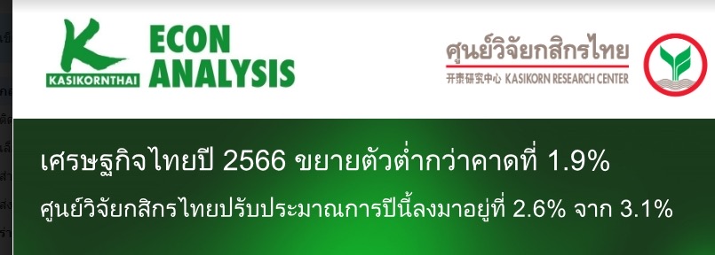 ศูนย์วิจัยกสิกรไทยคาดการณ์เศรษฐกิจไทยปี 67 จะเติบโตที่ 2.6% ปรับลดจาก 3.1%ที่ประเมินก่อนหน้า เนื่องจากโมเมนตัมในการใช้จ่ายภาคเอกชนที่ ชะลอตัวตามมาตรการกระตุ้นการบริโภคจากภาครัฐที่ลดลง ประกอบกับฐานที่อยู่ในระดับสูงของปีก่อนหน้า