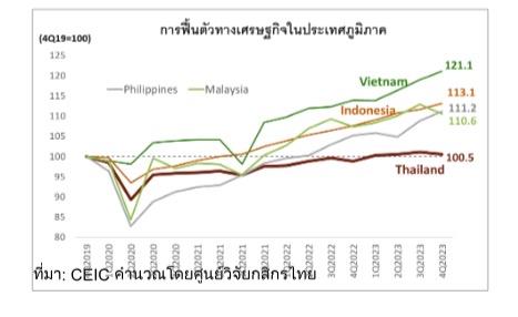 โดยทั้งปี 2566 เศรษฐกิจไทยขยายตัวเพียง 1.9% ต่ำกว่าที่เคยประเมินไว้ที่ 2.5%ส่งผลให้เศรษฐกิจไทยฟื้นตัวกลับมาสูงกว่าระ ดับก่อนวิกฤติโควิด (เทียบกับระดับ ณ ไตรมาส 4/2562) เพียง 0.5%ซึ่งเป็นระดับต่ำกว่าประเทศอื่นในภูมิภาคค่อนข้างมาก โดยส่วนหนึ่งเกิดจากปัญหาเชิงโครงสร้างที่ส่ง ผลให้เศรษฐกิจไทยมีศักยภาพในการเติบโตน้อยกว่าประเทศอื่นๆ