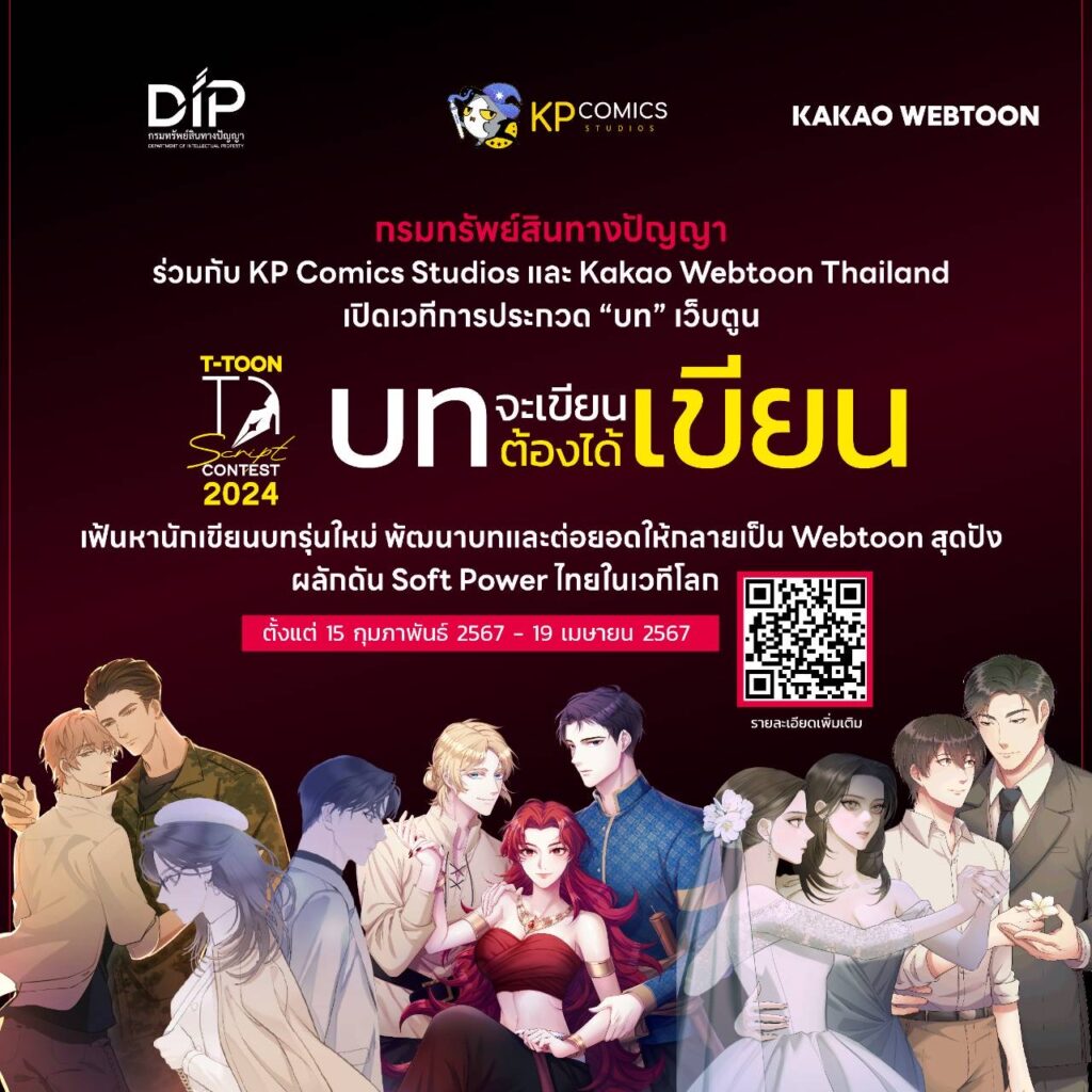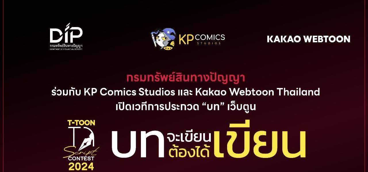 นนทบุรี 21 ก.พ.-กรมทรัพย์สินทางปัญญา ร่วมกับ KP Comics Studios และ Kakao Webtoon Thailand ผู้ผลิตและให้บริการแพลตฟอร์มการ์ตูนออนไลน์ (Webtoon) ยักษ์ใหญ่ จัดกิจกรรมสุดสร้างสรรค์ ประกวดบทการ์ตูนออนไลน์ “T-Toon Script Contest 2024 บทจะเขียนก็ได้เขียน” เฟ้นหานักเขียนบทการ์ตูนออนไลน์ไทยรุ่นใหม่ เสริมศักยภาพการเขียนเรื่องให้น่าสนใจ มีเอกลักษณ์น่าติดตาม พร้อมต่อยอดให้เป็นเว็บตูนเรื่องดัง ก่อนผลักดันเป็น Soft Power ใหม่ของไทยในเวทีโลก