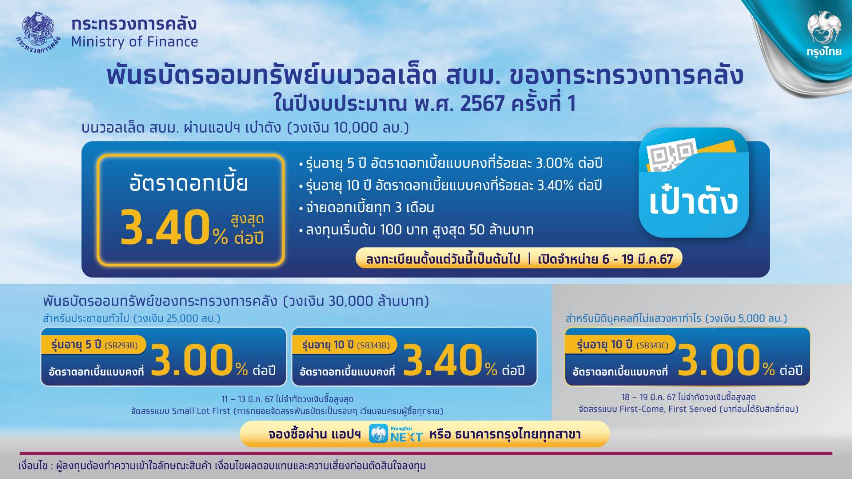 ธนาคารกรุงไทย เดินหน้าตอบโจทย์ผู้ลงทุน สร้างความมั่นคงทางการเงิน พร้อมขายพันธบัตรออมทรัพย์บนวอลเล็ต สบม. ของกระทรวงการคลัง ในปีงบประมาณ พ.ศ.2567 ครั้งที่ 1 ผ่านแอปฯ เป๋าตัง วงเงิน 10,000 ล้านบาท จำนวน 2 รุ่น รุ่นอายุ 5 ปี รับดอกเบี้ยคงที่ 3.00% ต่อปี และรุ่นอายุ 10 ปี รับดอกเบี้ยคงที่ 3.40% ต่อปี ระหว่างวันที่ 6-19 มีนาคมนี้ ส่งเสริมคนไทยออมเงินอย่างทั่วถึงและยั่งยืน ลงทุนง่าย เริ่มต้นเพียง 100 บาท