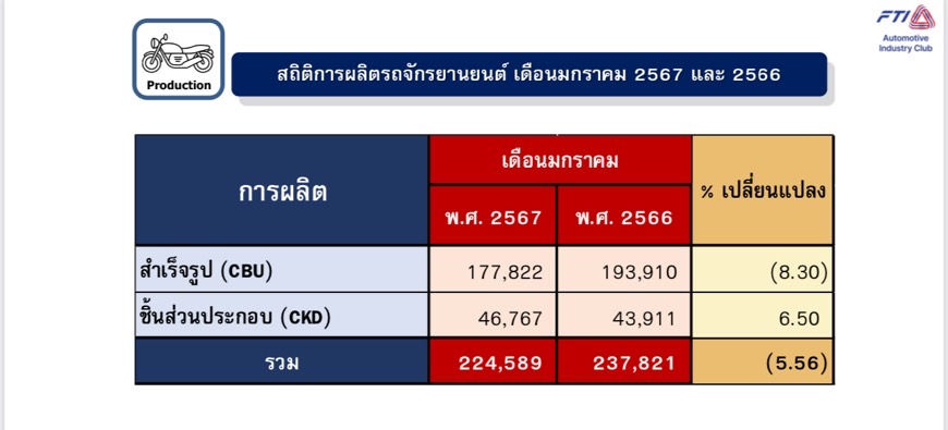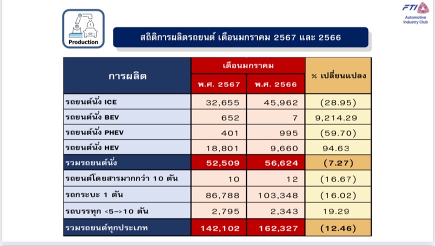 โดยเดือนมกราคม ผลิตรถยนต์นั่งได้ 52,509 คัน ลดลงจากเดือนมกราคม 2566 ร้อยละ 7.27 แบ่งเป็น