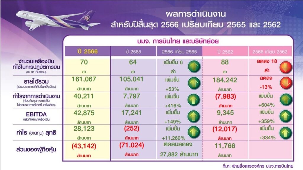 ในส่วนของผลการดำเนินงานสำหรับปี 2566 สิ้นสุด 31 ธันวาคม 2566 บริษัทฯ และบริษัทย่อย มีรายได้ไม่รวมรายการที่เกิดขึ้นครั้งเดียว 161,067 ล้านบาท เป็นรายได้จากกิจกรรมขนส่งผู้โดยสารที่เติบโตสูงขึ้นอย่างมีนัยสำคัญ 79.3% โดยรายได้ไม่รวมรายการที่เกิดขึ้นครั้งเดียวของปี 2566 ดังกล่าว เพิ่มขึ้น 53.3% จากปี 2565 และคิดเป็นสัดส่วน 87% ของปี 2562 ก่อนการระบาดของโควิด-19 โดยในปี 2566 มีค่าใช้จ่ายไม่รวมรายการที่เกิดขึ้นครั้งเดียว 120,856 ล้านบาท เพิ่มขึ้น 24.3% จากปี 2565 จากค่าใช้จ่ายผันแปรในส่วนค่าน้ำมันที่มีสัดส่วน 39.5% ของค่าใช้จ่ายรวมที่สูงขึ้นจากปริมาณการใช้ที่เพิ่มขึ้น และต้นทุนการบริการในกิจกรรมขนส่งจากปริมาณการผลิตที่เพิ่มขึ้น โดยมีกำไรจากการดำเนินงานก่อนต้นทุนทางการเงินไม่รวมรายการที่เกิดขึ้นครั้งเดียว (EBIT) เป็นเงิน 40,211 ล้านบาท สูงกว่าปีก่อน จำนวน 32,414 ล้านบาท และมี EBITDA จากการดำเนินงานหลังหักเงินสดจ่ายหนี้สินตามสัญญาเช่าเครื่องบิน 42,875 ล้านบาท ดีกว่าประมาณการตามแผนฟื้นฟูกิจการ ซึ่งเป็นหนึ่งในเงื่อนไขความสำเร็จของแผนฟื้นฟูกิจการที่ระบุว่าบริษัทฯ ต้องมี EBITDA จากการดำเนินงานในส่วนของการบินไทยหลังหักเงินสดจ่ายหนี้สินตามสัญญาเช่าเครื่องบินไม่น้อยกว่า 20,000 ล้านบาท ในรอบ 12 เดือนก่อนหน้าที่จะรายงานถึงผลสำเร็จการฟื้นฟูกิจการ