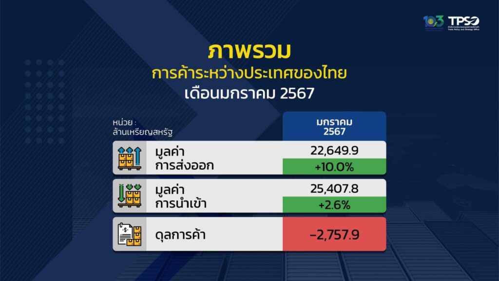 ส่วนตัวเลขการนำเข้า ของไทยในเดือนมกราคม 2567 มีมูลค่า 25,407 ล้านเหรียญสหรัฐฯ ขยายตัว 2.6% โดยไทยยังขาดดุลการค้า 2,757 ล้านเหรียญสหรัฐฯ เป็นต้น.-514-สำนักข่าวไทย