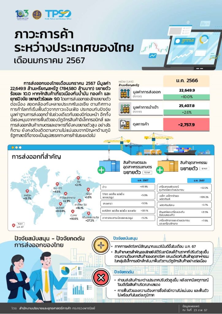 นายกีรติ รัชโน ปลัดกระทรวงพาณิชย์ เปิดเผยภาวะการค้าระหว่างประเทศของไทยในเดือนมกราคม 2567 พบว่า มีมูลค่า 22,649 ล้านเหรียญสหรัฐฯ ขยายตัว 10% เป็นบวกต่อเนื่องเป็นเดือนที่ 6 และขยายตัวสูงสุดในรอบ 19 เดือนนับจากเดือนมิถุนายน 2565 ถือว่าเป็นไปตามทิศทางเดียวกันกับการค้าโลก ที่เริ่มฟื้นตัวจากภาวะเงินเฟ้อ โดยการส่งออกในหลายประเทศ ขยายตัวได้ดี เช่น เวียดนาม การส่งออกในเดือนมกราคม ขยายตัวถึง 42% ไต้หวัน บวกถึง 18.1% เกาหลีใต้ บวก 18% และสิงค์โปร บวกถึง 15.7%