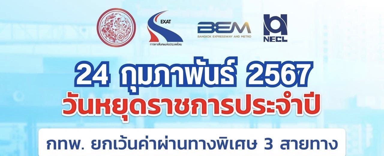 การทางพิเศษแห่งประเทศไทย (กทพ.) กระทรวงคมนาคม ยกเว้นค่าผ่านทางพิเศษของทางพิเศษ รวม 3 สายทาง ดังนี้ ทางพิเศษเฉลิมมหานคร (ทางด่วนขั้นที่ 1) จำนวน 19 ด่าน ทางพิเศษศรีรัช (ทางด่วนขั้นที่ 2) จำนวน 31 ด่าน และทางพิเศษอุดรรัถยา (บางปะอิน-ปากเกร็ด) จำนวน 10 ด่าน ในวันเสาร์ที่ 24 กุมภาพันธ์ 2567 (วันมาฆบูชา) ตั้งแต่เวลา 00.01 น. ถึง 24.00 น. ซึ่งเป็นวันหยุดราชการประจำปีตามประกาศสำนักนายกรัฐมนตรี