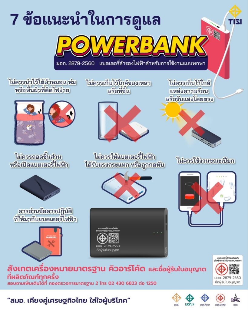 สำหรับการเลือกซื้อพาวเวอร์แบงก์ที่ได้มาตรฐานนอกจากจะให้สังเกตเครื่องหมาย มอก. และ QR Code ที่ปรากฏอยู่บนสินค้าทุกครั้ง การเก็บรักษาและการใช้งานเพื่อไม่ให้พาวเวอร์แบงก์หมดอายุการใช้งานก่อนเวลาอันควร เช่น ไม่ควรเก็บไว้ใกล้แหล่งความร้อน ไม่ควรเก็บไว้ใกล้แก๊สที่ติดไฟได้ ความชื้น น้ำ หรือของเหลว ไม่ควรถอดชิ้นส่วน เปิด เผา ไม่ควรให้พาวเวอร์แบงก์ถูกกระแทก ถูกกดทับ งอ หรือเจาะ และควรอ่านข้อควรปฏิบัติที่ให้มากับพาวเวอร์แบงก์ด้วยทุกครั้ง เพื่อให้สามารถใช้งานได้อย่างถูกวิธีและมีความปลอดภัย